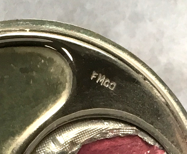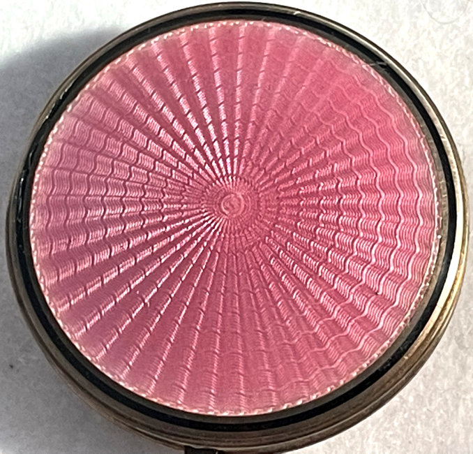 Sterling Silver Candy Pink Enamel Guilloche Compact by F & B Co. Here is a truly gorgeous enamel guilloche compact by F & B Co. in sterling silver with a candy pink enamel guilloche design in concentric circles covering the entire top. There is a narrow black band at the outermost edge to set it all off. Back of compact is engine turned and the entire compact appears to be gold vermeil. Inside is a full mirror in the lid and a powder pat in the bottom. There is a Richard Hudnut lambswool puff inside which is obviously not original but was inside when I purchased it so it will remain. Enamel is in perfect condition with no apologies whatsoever which is amazing for the size of it! Compact also has a slightly curved shape to the top and the bottom so it has a slight pillow shape to it. There is a very slight "dent" on one side that isn't noticeable unless you are looking for it. Otherwise it is in great shape. Measures 2-1/8" diameter. (Click on pic for more photos.) |