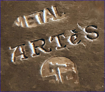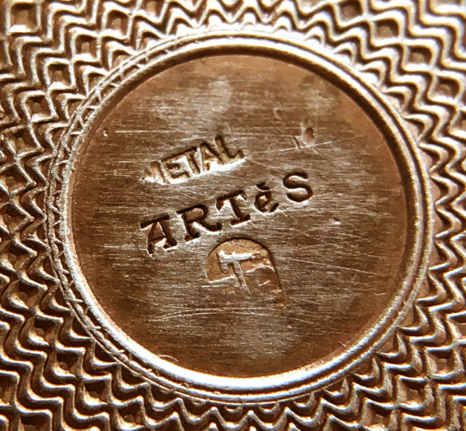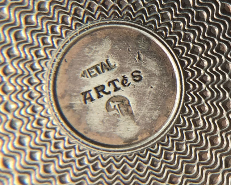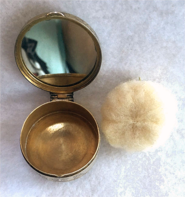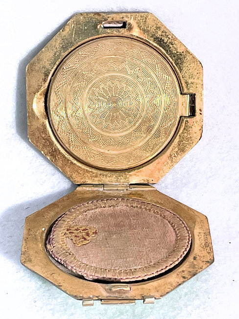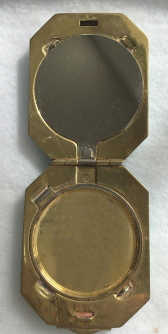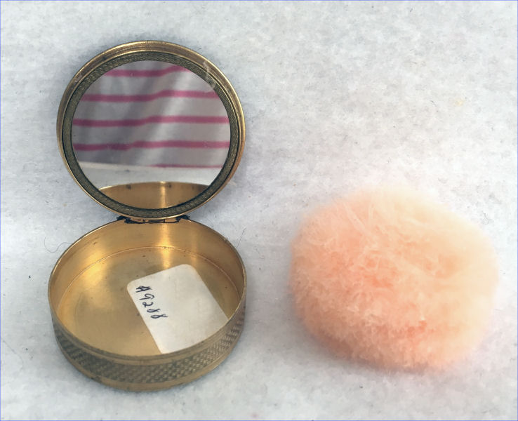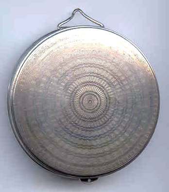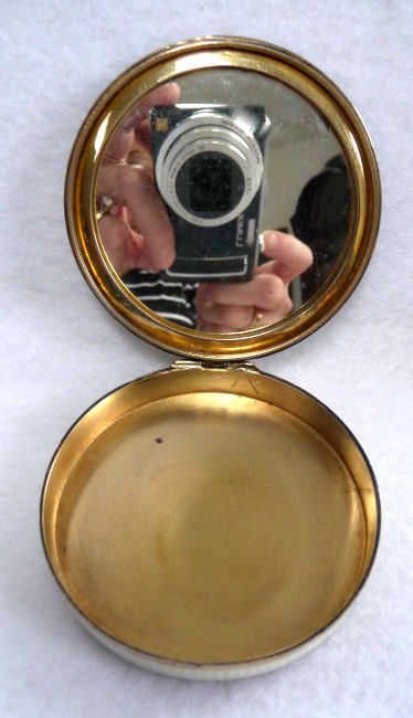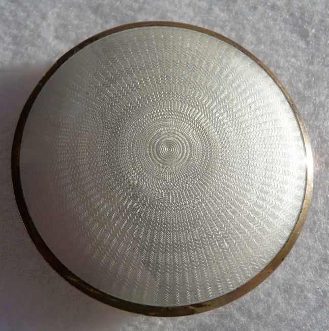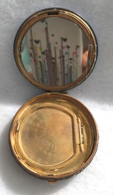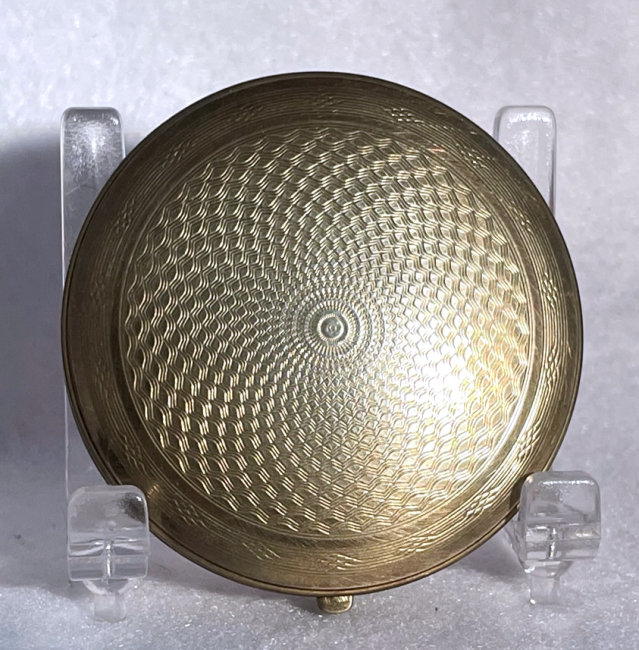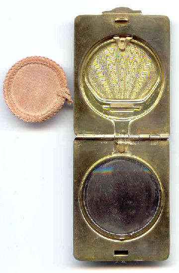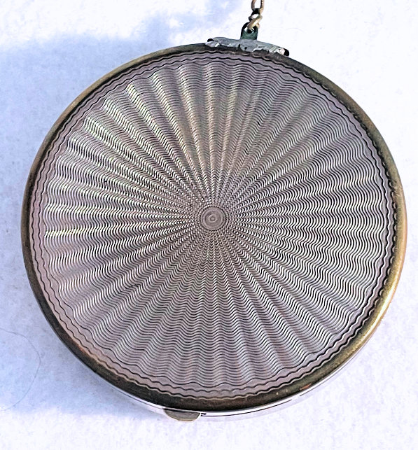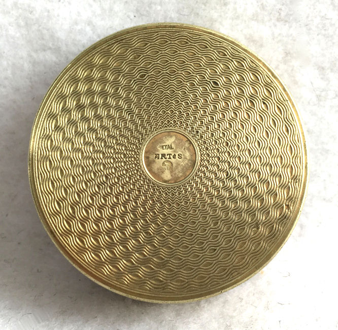 This is a very pretty little compact in damascened brass with a full enamel guilloche top surrounded by a white enamel border. The top is a pale peach color with beautiful radiant designs that almost give it a holographic appearance. Inside is a full mirror in the lid and a fluffy peach swansdown puff. The base could hold either a powder pat or loose powder. The little puff has never been used and is in perfect condition as is the entire compact. It is signed on the base METAL ARTéS and a symbol that I can't make out entirely. Measures 1-1/ 2" diameter. (Click on pic for more photos.) |