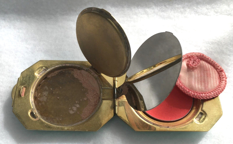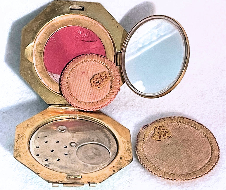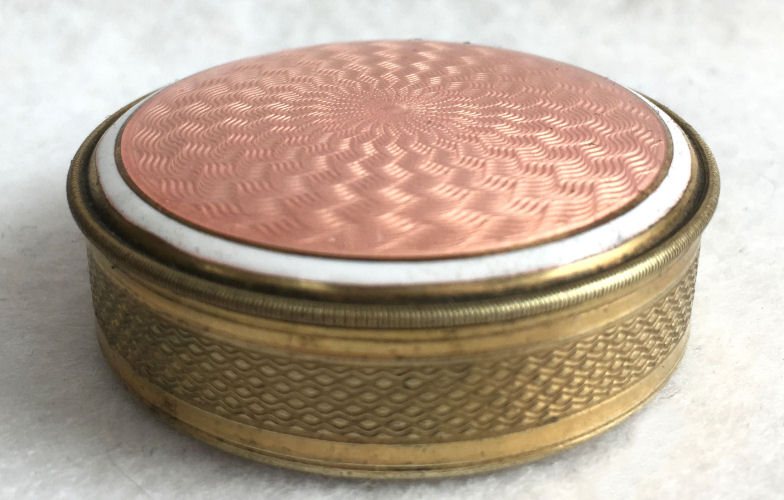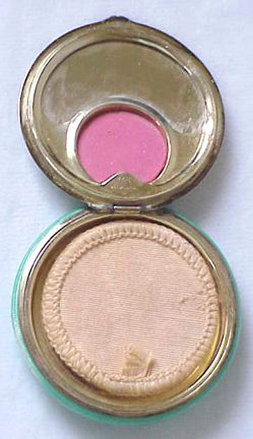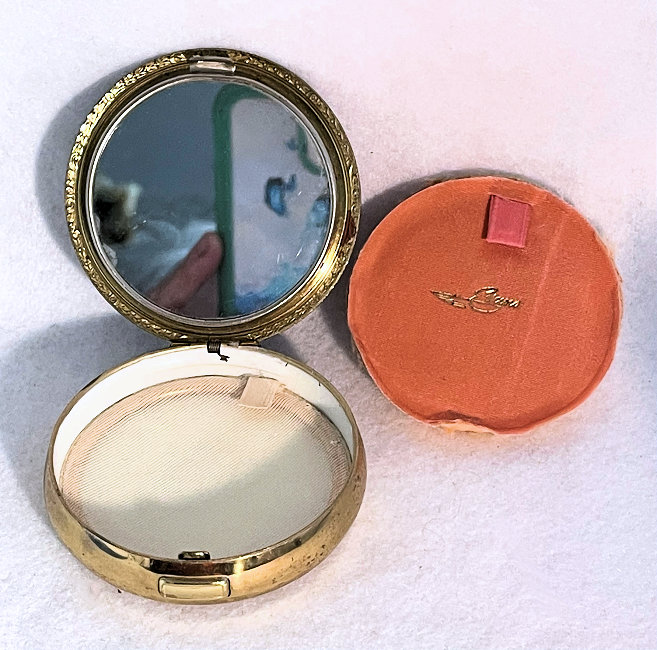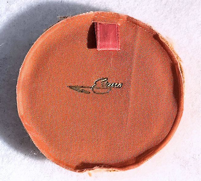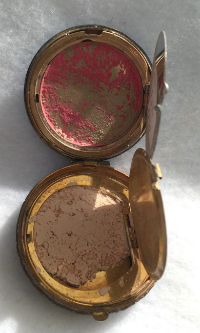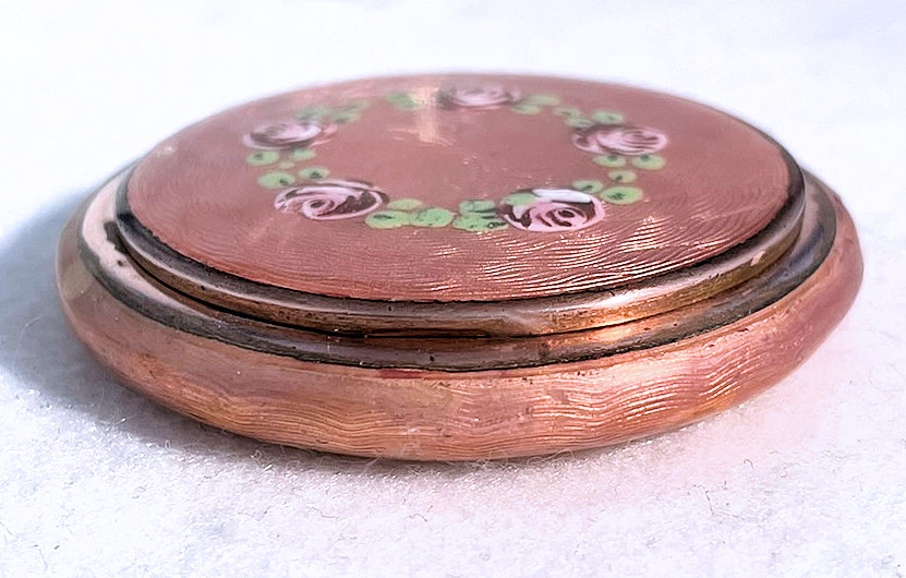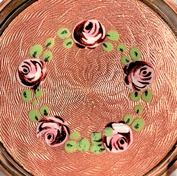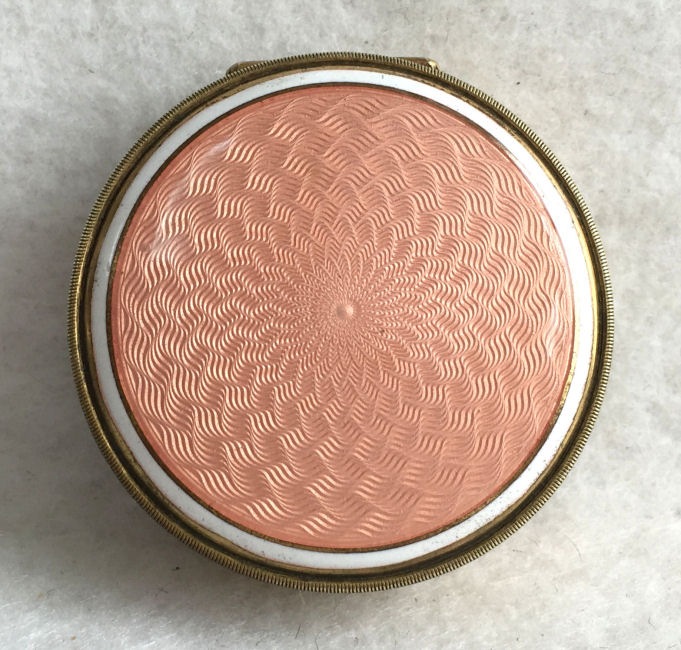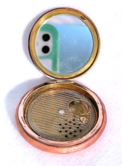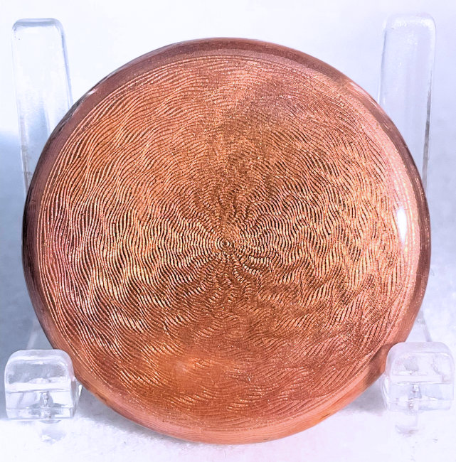 This compact has been in my collection for so many years mainly due to its unusual coloring. It's not quite pink, not quite peach, but somewhere in between. The metal is a coppery color which does show some wear. The back of the compact is the same color but has deep gold highlights that move in the light. The inside of the compact has a full mirror in the lid which is in excellent usable condition. The base has a rotating powder sifter with engine turned designs. This compact was well-loved by some previous owner and has some touch-ups to the enamel around the edges. These were done years ago and aren't really that noticeable (my photos make them look much worse!). Measures 2" diameter. (Click on pic for more photos.) |