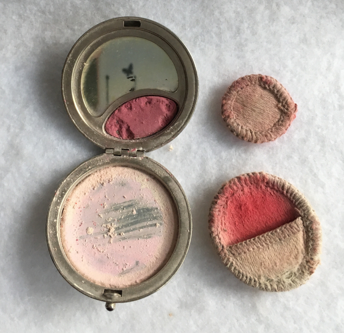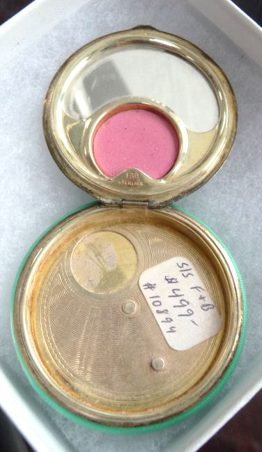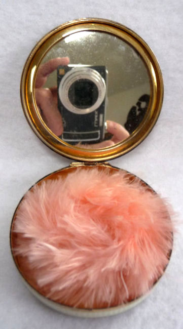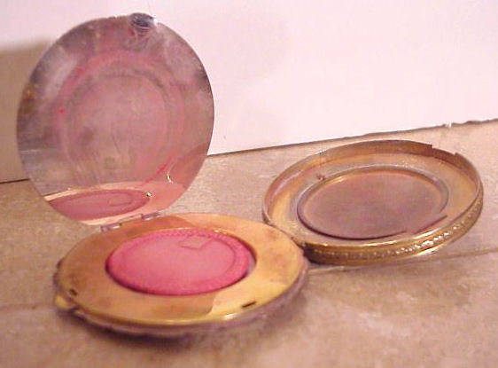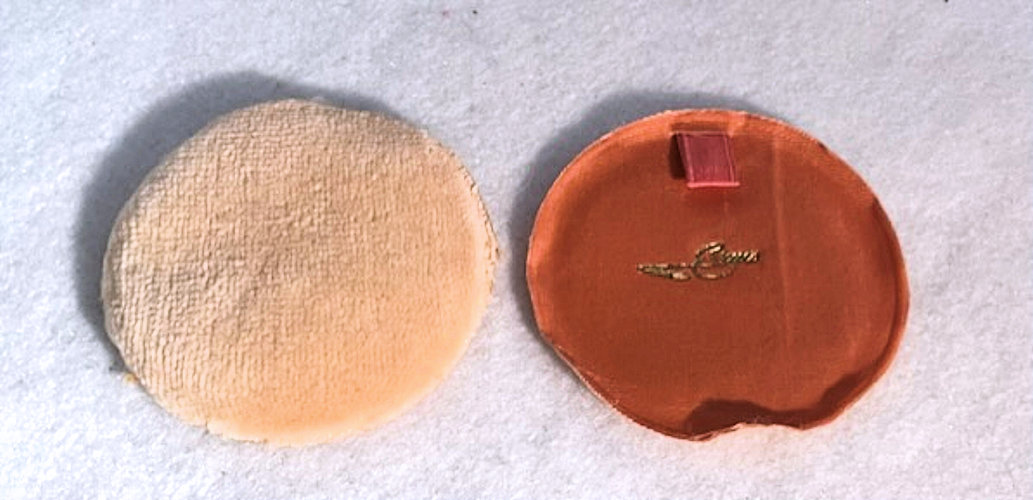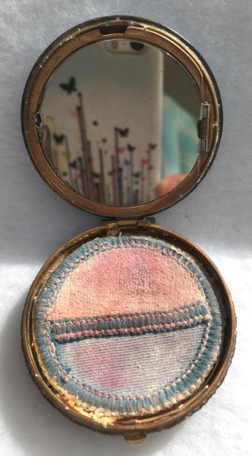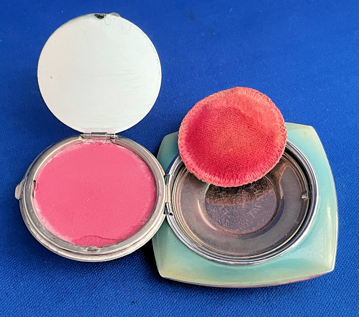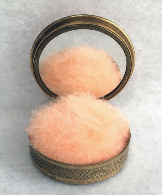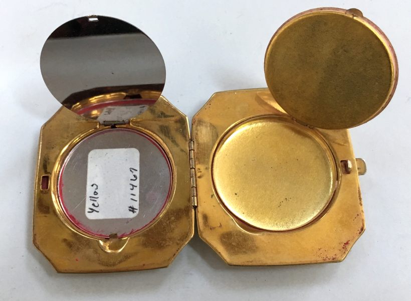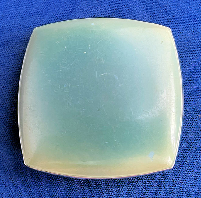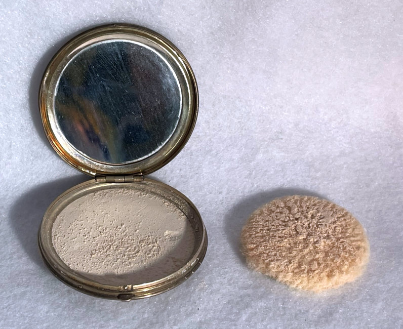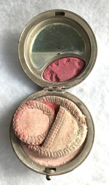 This compact has been in my collection for so many years mainly due to its unusual coloring. It's not quite pink, not quite peach, but somewhere in between. The metal is a coppery color which does show some wear. The back of the compact is the same color but has deep gold highlights that move in the light. The inside of the compact has a full mirror in the lid which is in excellent usable condition. The base has a rotating powder sifter with engine turned designs. This compact was well-loved by some previous owner and has some touch-ups to the enamel around the edges. These were done years ago and aren't really that noticeable (my photos make them look much worse!). Measures 2" diameter. (Click on pic for more photos.) |