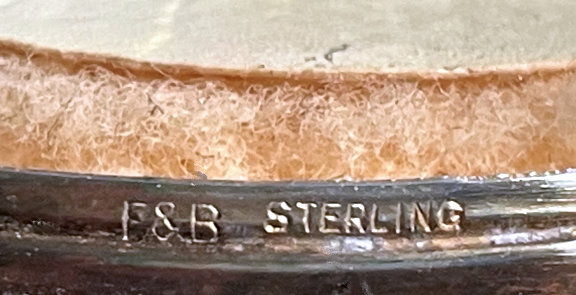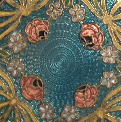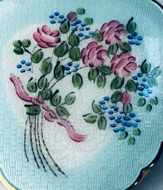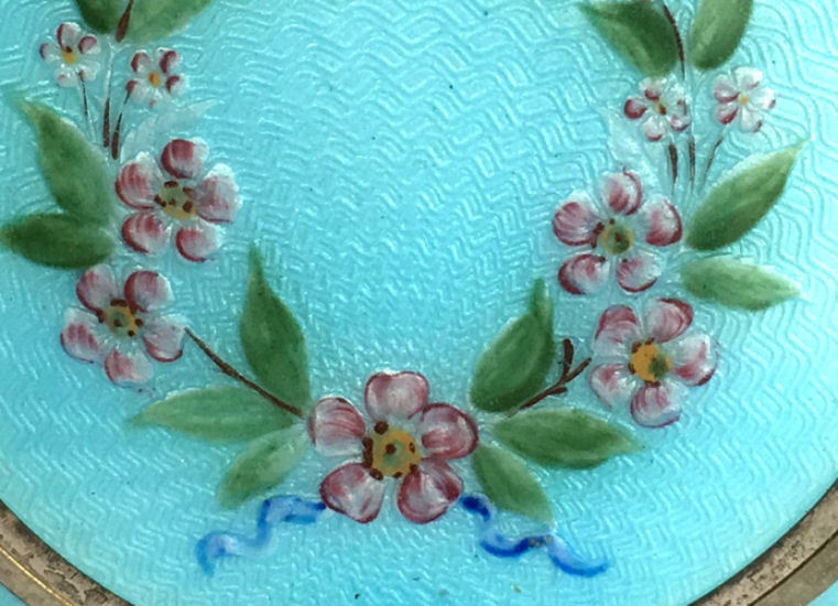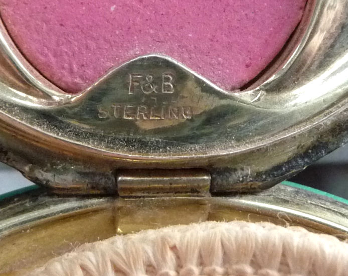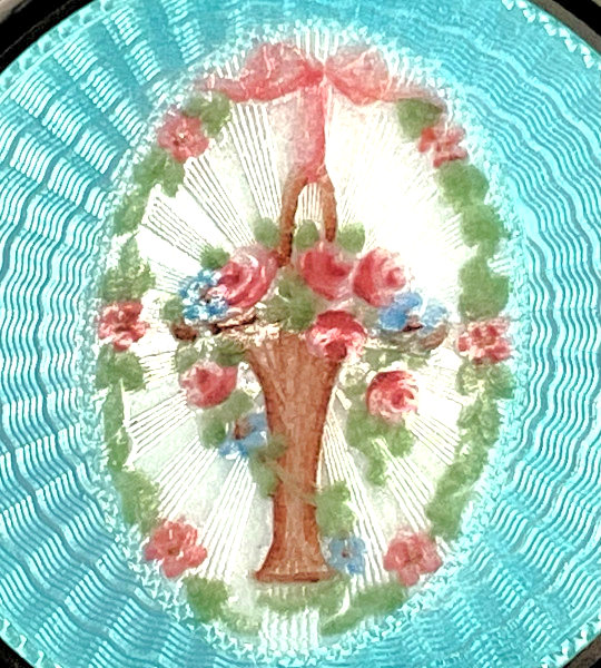 In my opinion, F & B makes the most beautiful compacts. The colors are always so breathtaking and the depth of the enamel guilloche is above and beyond the norm. This one features a gorgeous center vignette in snowy white with a pink-ribboned flower basket overflowing with pink roses and blue forget-me-nots surrounded by a radiating design of turquoise enamel guilloche. When opened, there is a spring-loaded mirror with a celluloid backing which springs up from the powder sifter beneath. There is an original puff still inside. The top of the compact has a built-in rouge pot with rouge still inside and a little bar which holds the original puff which is also still inside. Marked "F & B Sterling" on rim and has patent date of 9-21-1926 on the inside lid. As for condition, the top and bottom are nearly perfect with just some teeny scratches visible when held at an angle to the light and very close inspection. There is a chip on the edge of one side at about 11:00 position and another even smaller one at about 7:00 on the side. Both are pictured in the close-up photos. Even so, it's a stunningly gorgeous compact that would highlight any collection! Measures 2-1/8" diameter. (Click on pic for more photos.) |