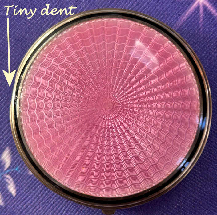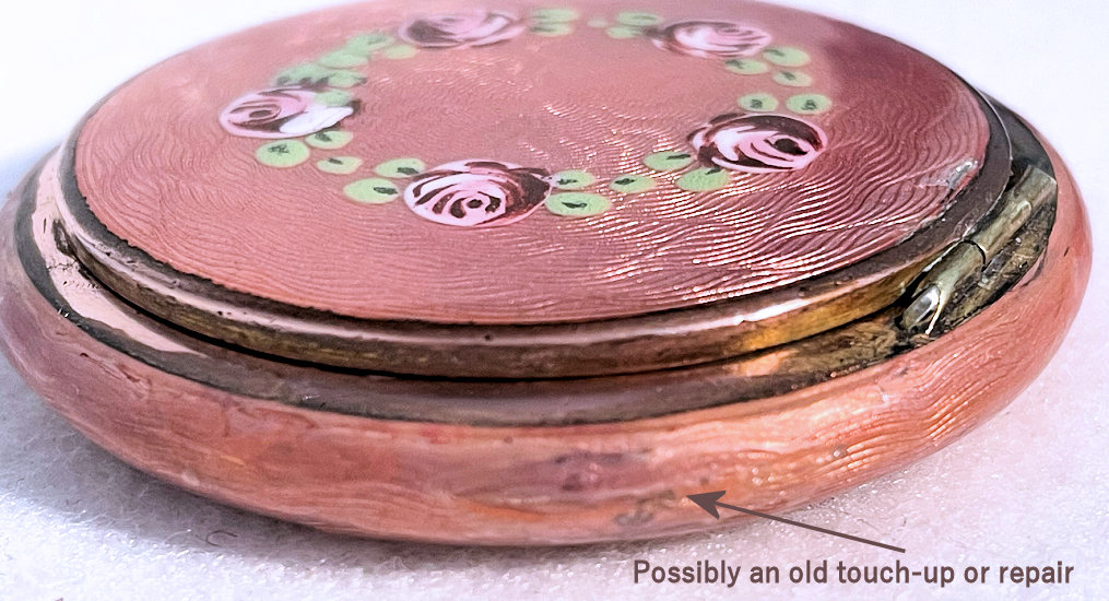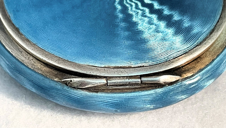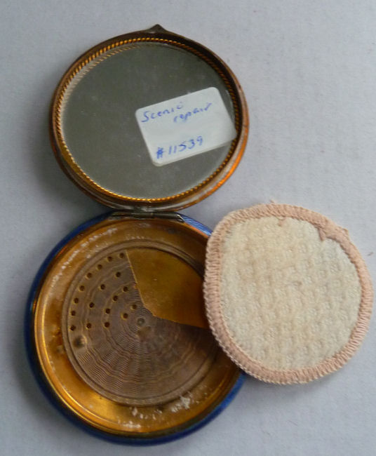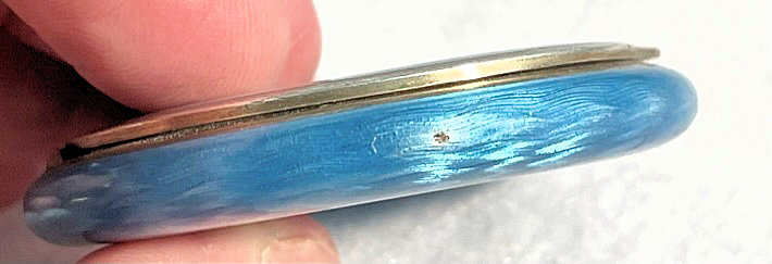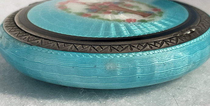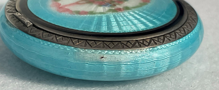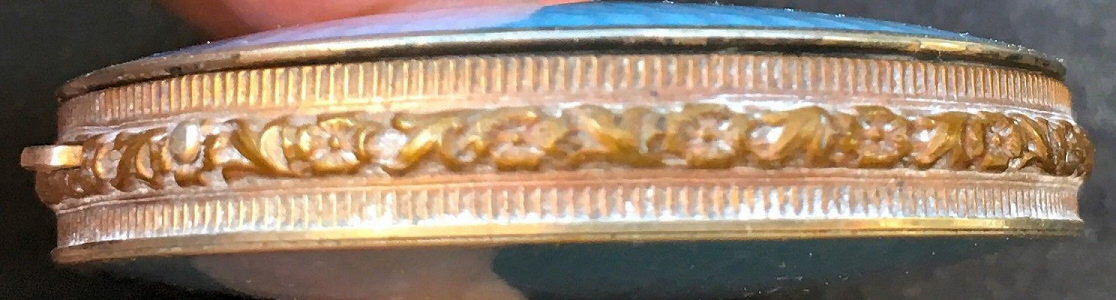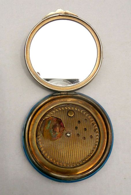 Painters who painted these compacts took artistic license and duplicated this famous painting with many variations and this is no exception. The scene is beautifully done with subtle color changes in an enameled top - not guilloche - while the back of the compact is finished in a lovely deep periwinkle blue which is enamel guilloche. Rarely do you find the combination of both types of enameling on one compact but the effect is stunning. The painting on the lid completely covers it with no border at all. It is not sterling but has a copper color to the metal. Inside the lid is a mirror with a rope bezel retainer. The bottom has a rotating sifter in gold and an old puff which is probably not original. There are no makers marks. As for condition, the enamel on the lid is perfect and the bottom is perfect. On one side at about the 3:30 position is a very old and very well done repair. I have seen papers in compacts where you could actually return them to the maker to be repaired professionally and this appears to have been done in that way. Please see all pics for close-up of this area. Measures 2-1/8" diameter. (Click on pic for more photos.) |