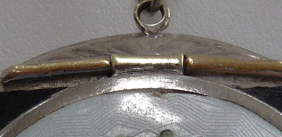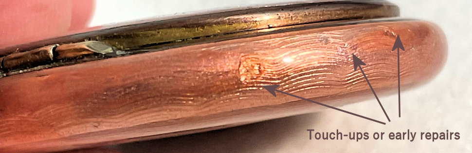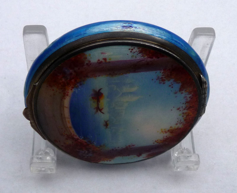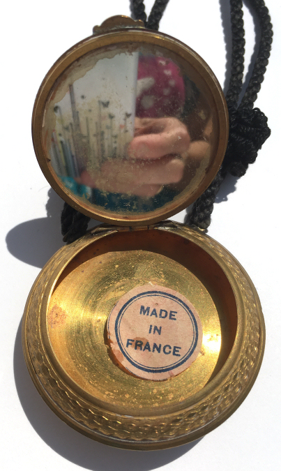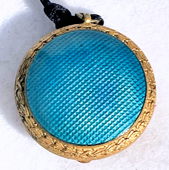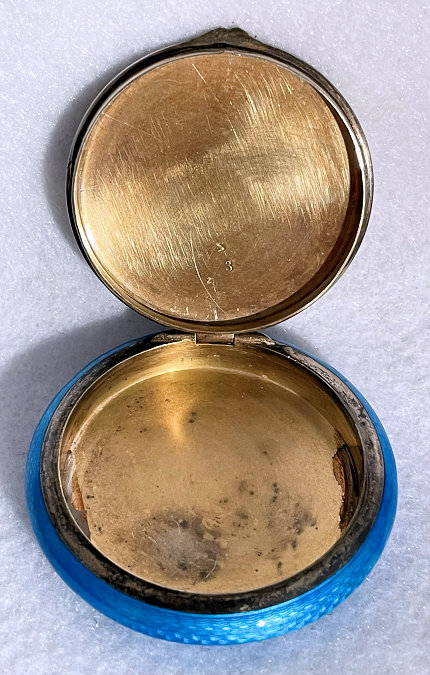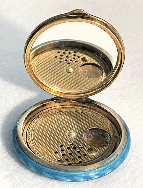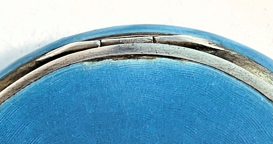 Painters who painted these compacts took artistic license and duplicated this famous painting with many variations and this is no exception. The scene is beautifully done with subtle color changes in an enameled top - not guilloche - while the back of the compact is finished in a lovely deep periwinkle blue which is enamel guilloche. Rarely do you find the combination of both types of enameling on one compact but the effect is stunning. The painting on the lid completely covers it with no border at all. It is not sterling but has a copper color to the metal. Inside the lid is a mirror with a rope bezel retainer. The bottom has a rotating sifter in gold and an old puff which is probably not original. There are no makers marks. As for condition, the enamel on the lid is perfect and the bottom is perfect. On one side at about the 3:30 position is a very old and very well done repair. I have seen papers in compacts where you could actually return them to the maker to be repaired professionally and this appears to have been done in that way. Please see all pics for close-up of this area. Measures 2-1/8" diameter. (Click on pic for more photos.) |