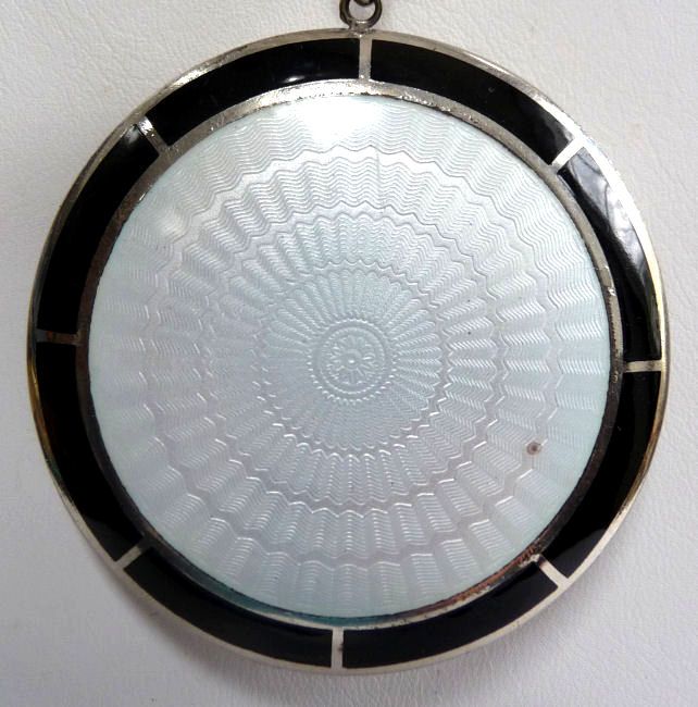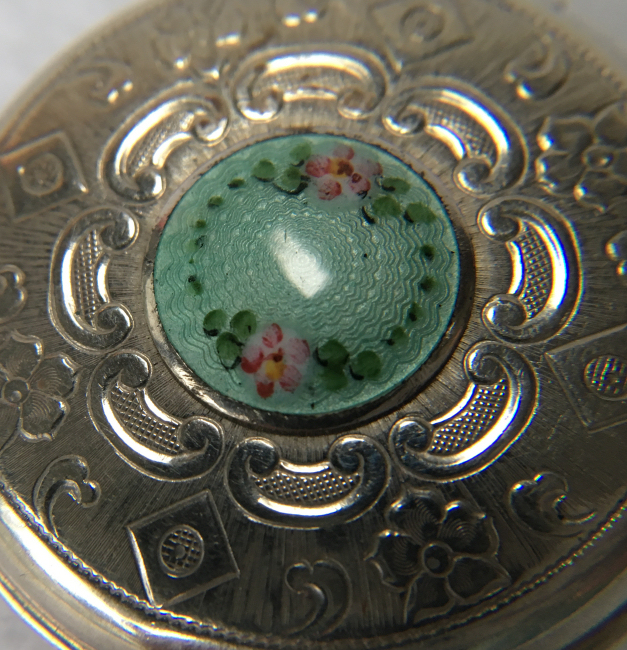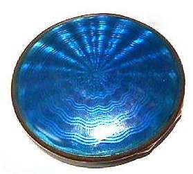 The color in this Austrian enamel guilloche compact is just breathtaking. Picture does not show it well, but color is a deep, dark turquoise on both front and back. On the lid there is a center design of a flower basket and flowers cut into the silver background and silhouetted against solid black enamel. Interior features a beveled mirror int he lid and a rotating poweder sifter in the base. The Austrian mark is not visible but I'm sure it is under there as I have had others with this identical design. They are usually marked under the sifter and are also usually sterling. Since I can't see the mark on this one, I can't guarantee sterling but my guess is that it is. Measures 2-1/8" diameter and is in very good condition with only superficial scuffs from wear. I have shown photos in two different lights to try to show depth of color.(Click on pic for more photos.) |