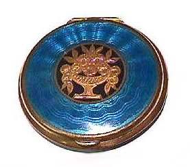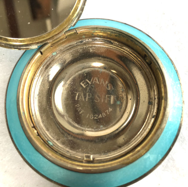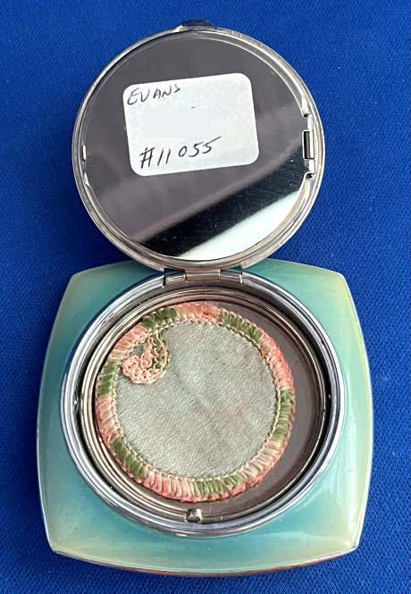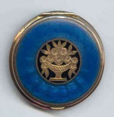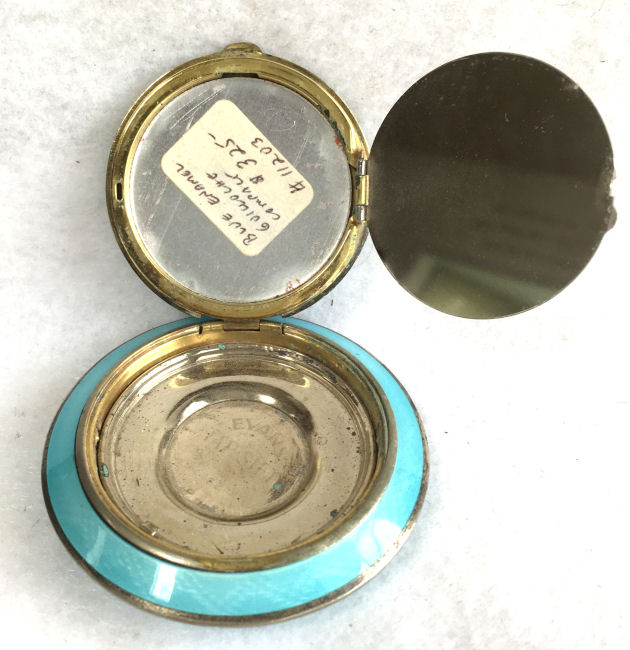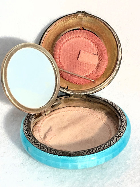 Here we have a truly gorgeous compact made by Evans. It is completely done in robin's egg blue enamel guilloche on the front and the back in three different guilloche designs. The lid portion has a garland of hand-painted pink flowers that resemble dogwoods. The blue on the back of the compact is slightly darker in the center section and lighter in the border ... very unusual! Inside you will find a mirror in the lid portion which opens to reveal a rouge pot. The base has a tap sift powder dispenser. It is signed Evans on the powder section. Overall it is in excellent condition with only a flake on the back edge of clear enamel top coat missing. This is barely noticeable and appears as a slightly lighter area on the edge (see photos for close-ups) and price reflects this. Measures 2-1/4" diameter. (Click on pic for more photos.) |