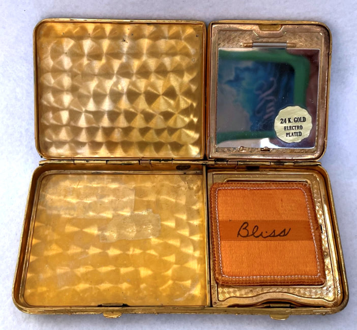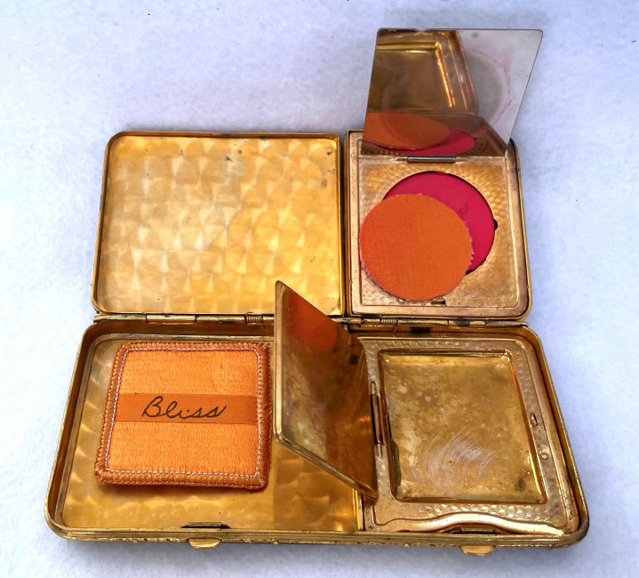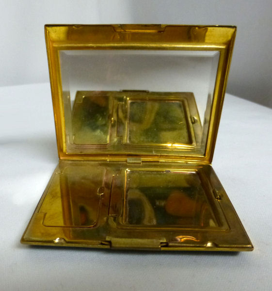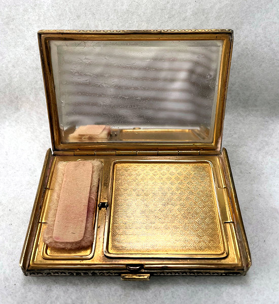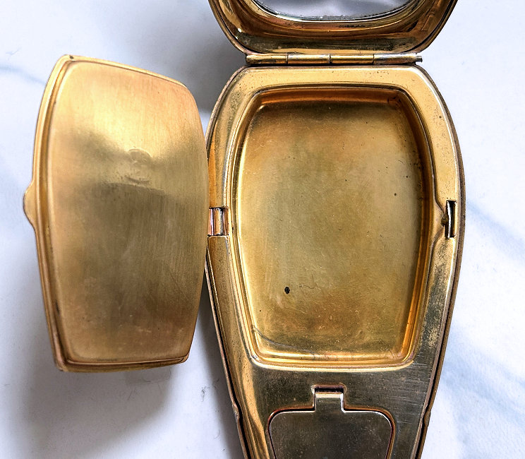 This is a very unusual and beautiful double compact with double enamel guilloche tops with hand-painted roses and forget-me-nots by Bliss Brothers. It is double wide and features a large section on the left to hold paper money or cigarettes or what have you. The other side has a multi-compartmented interior with a covered powder well in the base and a mirror in the id which opens to reveal a rouge pot with rouge intact. Both powder and rouge pot have their original puffs (the powder one is marked Bliss). The original sticker on the mirror reads "24K. Gold Electro Plated" and the gold plating is in beautiful condition. The entire compact has never been used and is in excellent condition with the only thing worth mentioning is some superficial scuffing on the bottom from being stored for so many years and moved around. None are noticeable unless really inspecting with magnification or better eyes than mine! Measures 5" wide x 2-1/2" high. (Click on pic for more photos.) |