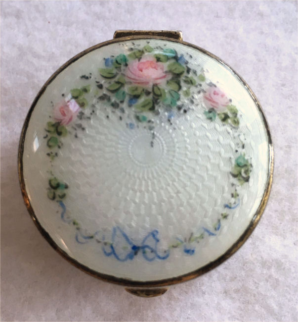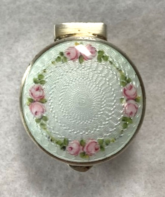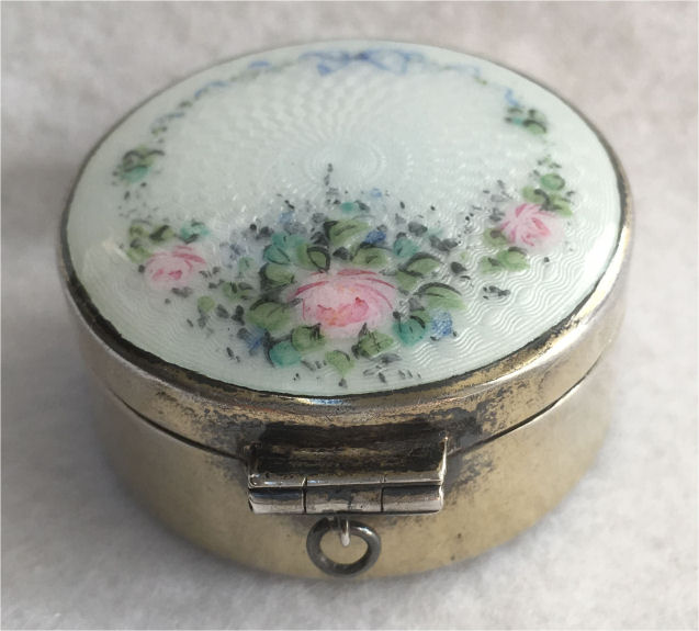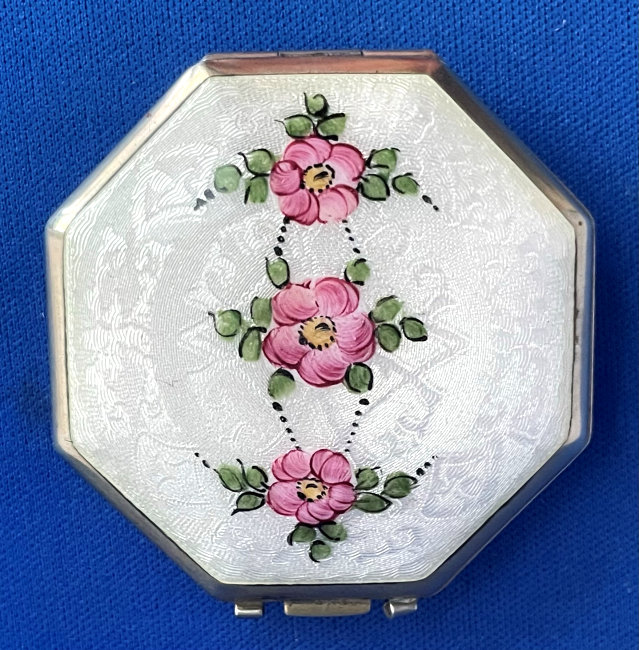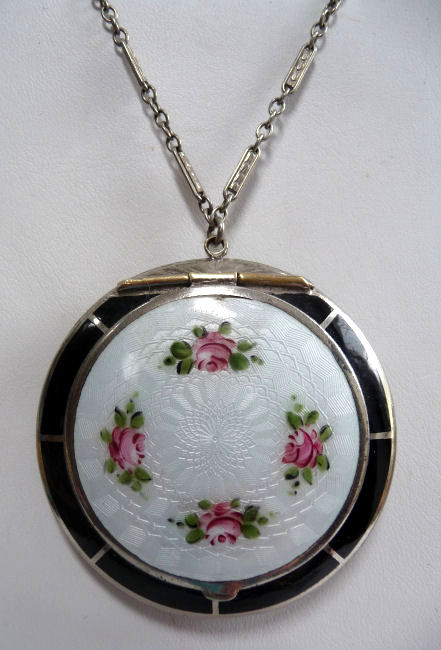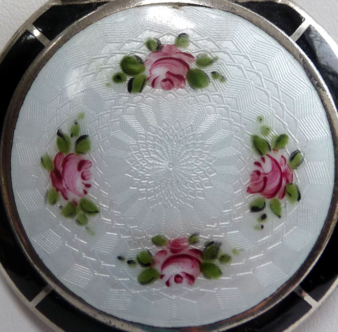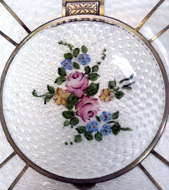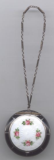 Here is a delightful little compact with an attached bar and link chain wrist handle ... the entire lid portion is done in snow white enamel guilloche with four pink roses. The outer rim is done in black cloisonne' enamel. The back of the compact is identical to the front minus the roses. Atop the hinge is a very pretty diamond cut design engraved in the metal ... a really nice touch! Inside the compact there is a crescent shaped mirror in the lid and an open rouge pot. The base is engine turned and open for loose powder. There is no puff. As for condition: this is not a sterling compact and some of the silver has wear to it that is much worse looking in my photos. There is a teeny little speck of enamel loss righ at the top of the white front center at the very edge. On the back is a little brown dot beneath the enameling that shows through the white ... this is not a chip, it is under the enameling. All of that being said, this is still a very beautiful compact that to the naked eye appears perfect. It is my pictures that make it look bad! :-) It measures 2-1/4" diameter and the chain has a 5" drop. The compact is pillow shaped. (Click on pic for more photos.) |