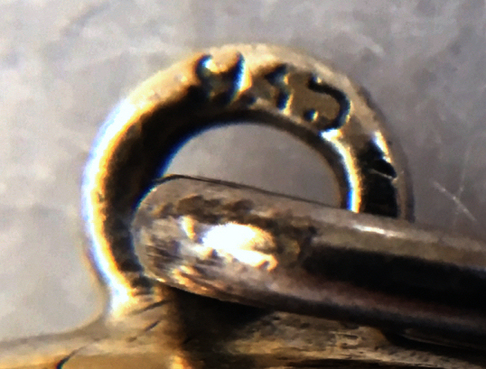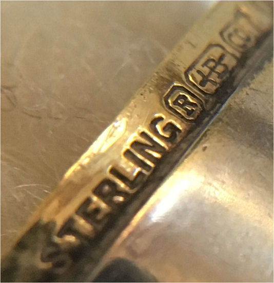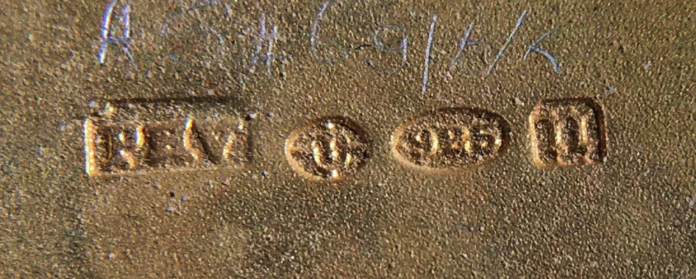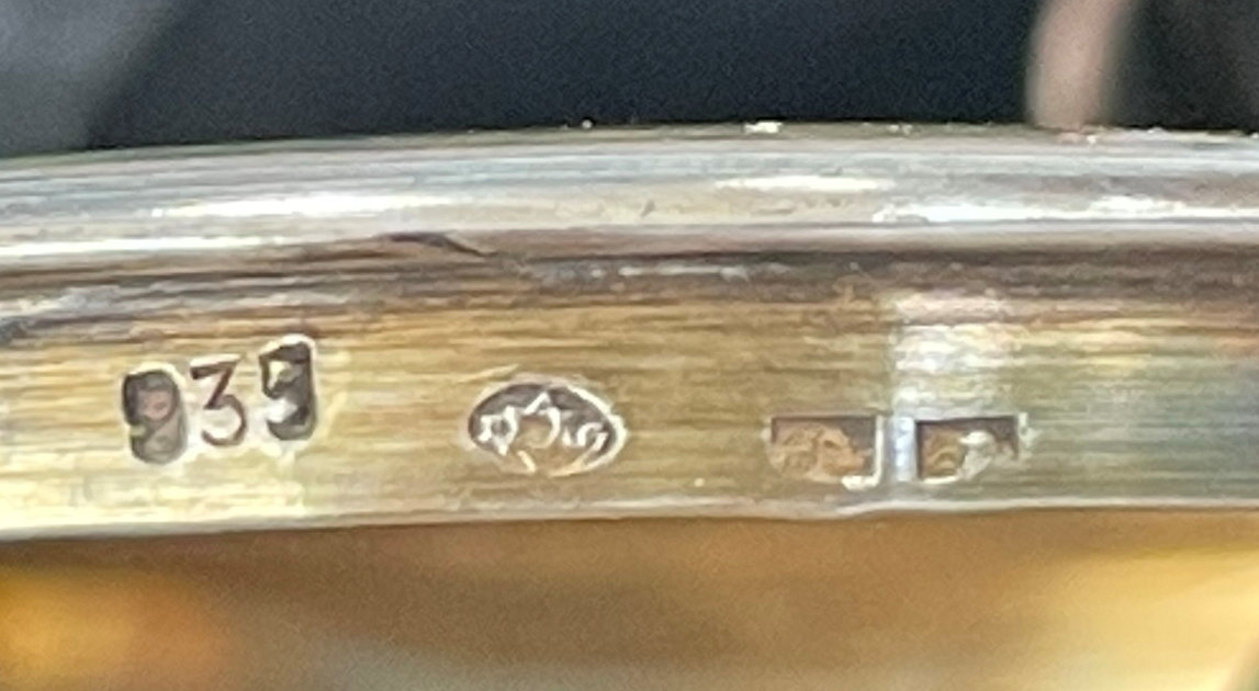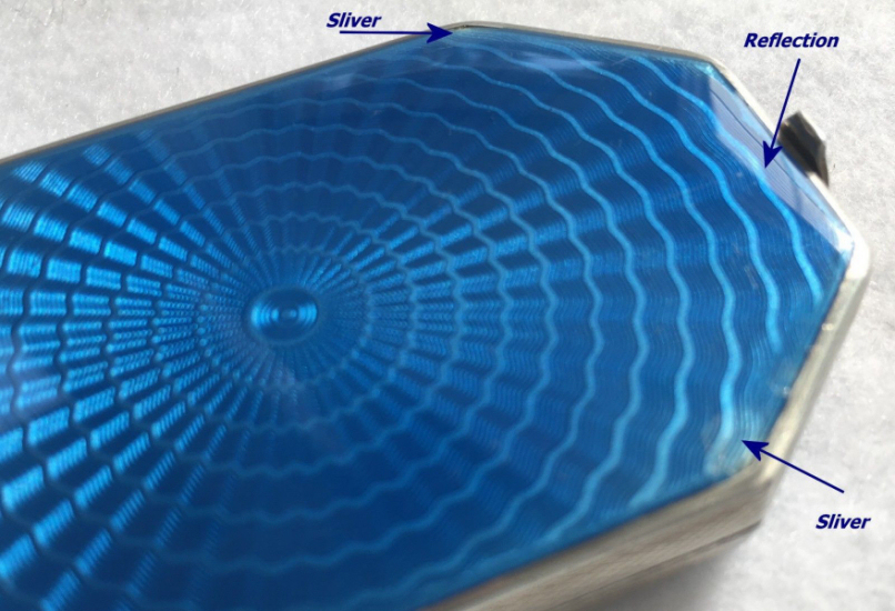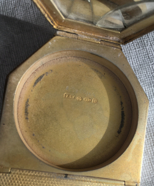 I am so pleased to be able to offer this extraordinary sterling silver double enamel guilloche compact which has been in my collection since 2005. I only recently was able to find out some information about the hallmarks on this one. According to Marks4Antiques.com, the compact was made by PHV, a silversmith known to work in Switzerland. The item was then imported to London, England, in 1908 (the "n" hallmark denotes this). Therefore, it was made in Switzerland prior to that year, so it would be made in 1907 or earlier. The front and back are identically done in a rich shade of blue enamel guilloche in radiating concentric circles that have a sunburst design. When the compact is moved, the rays look like they are actually moving. The compact is shaped like an elongated octagon. The case opens with a small hasp on the front. Inside you will find a full mirror in the lid (the mirror is broken at the very bottom but the pieces are in place and the mirror is still usable as is). The bottom half is exquisitely detailed with a hinged covered rouge compartment and a powder well atop that. It is all finished in gold vermeil. Both the removable rouge and powder pots are by Houbigant and are marked as such on the bottom. The hallmarks can be found in the powder compartment. The first mark is PHV for the maker, the second is the import mark, the third is the 925 sterling mark, and the last mark is the letter "n" for the year 1908 in London. I am leaving the mirror as is for the purist, but it is not beveled so could be easily replaced if desired. Enamel guilloche on the top of the case is in excellent condition with only a few minor scratches noticeable on very close inspection (I didn't notice them at all until looking at this with a magnifying glass). The enamel guilloche on the back of the case has 3 or 4 "slivers" in the clear topcoat which cannot be seen when looking at it directly. However, when you turn it into the light, you can see where a little "slice" of the clear section is missing right along the edge at 3 of the corner spots. I tried to photograph this and you can see them in one photo but again, they are very hard to discern in person. This is a large piece measuring 3" x almost 1-3/4" across. (Click on pic for more photos.) |