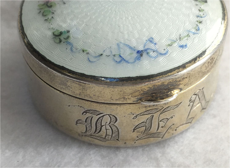 This beautiful compact was made by R. Blackinton Co. and featuresa beautiful snow white enamel guilloche lid with hand-painted roses and a blue ribbon. It has a mirror inside the lid and a tiny ring on the back hinge for attaching to a chatelaine or a necklace. The front has the letters "B E A" inscribed which could be initials or the name Bea ... makes you wonder about the young lady who treasured this a century ago! Since it has a mirror, it could be used as either a compact with loose powder or as a patch box. I am including a darling little merino lambswool puff. It is in excellent condition with only some very minor superficial scuffs only visible when turned in the light ... very difficult to see with the naked eye Hallmarked on inside rim. Measures 1-1/2" diameter x 3/4" deep. Lid is slightly domed. (Click on pic for more photos.) |