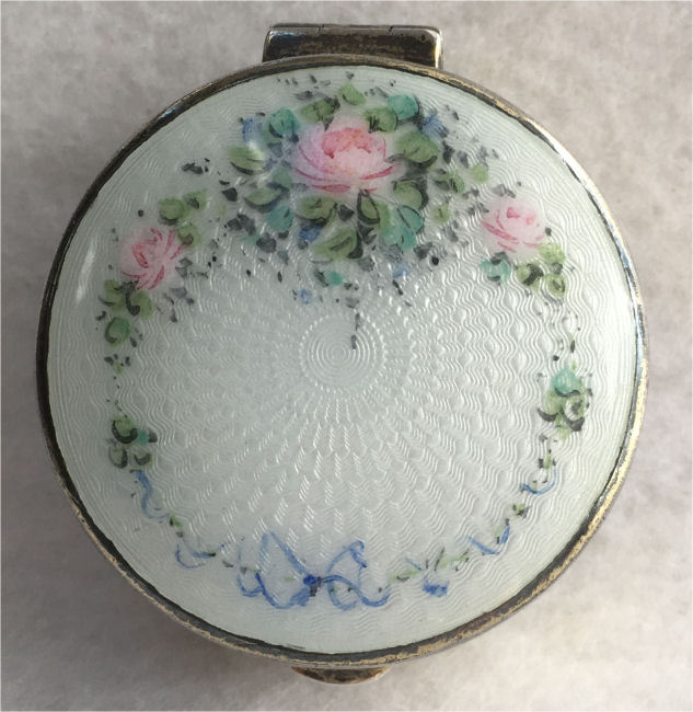 Here is another stunning example of Thomae's superb workmanship ... this sweet little compact again features a full enamel guilloche lid, this time in snow white with a garland of pink roses in full bloom and a single rose in the center. There is a ring at the top behind the hinge where a chainlink handle could be attached but this did not have one. Ironically, it is identical in every way to the one above with the exception of the design on the lid and the back. Inside is a mirror in the lid and there is a loose powder pat in the bottom. I am including a new tiny lambswool puff with a little pink bow ... absolutely adorable and perfect for this piece. The base of the compact is polished silver with no engine turned design. The enamel guilloche is in excellent condition with no notable damage whatsoever. There are a few tiny dents in the silver case, most on the bottom, but nothing significant. It is a lovely piece. Measures 1-1/2" diameter. (Click on pic for more photos.) |