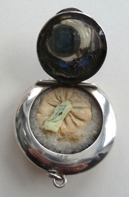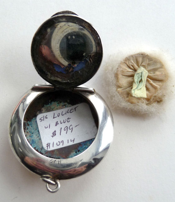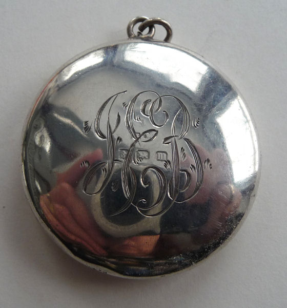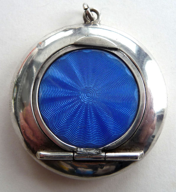 This pretty little sterling silver compact is meant to be sworn as a pendant or attached to a chatelaine. The lid portion is covered in a rich Wedgwood blue shade of enamel guilloche. It opens so that when it is raised to your face, the compact mirror would be facing you. The back of the case is elegantly monogrammed "JEB". Inside the compact is a little swansdown puff (well worn) with a ribbon tab. The original mirror in the lid has a very wide bevel but alas, the silvering is pretty well shot. This is a very early piece probably dating from the mid to late 1800's. There are hallmarks on the rim but they are so worn I can't date it definitively but they appear to be English, probably Birmingham or London. The silver content is very high and there are two very tiny dents in the outer rim but the enamel guilloche is all perfect. It is a very sweet piece! Measures a wee bit over 1-1/2" diameter. (Click on pic for more photos.) |