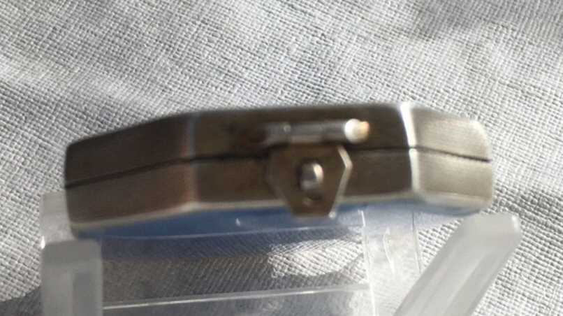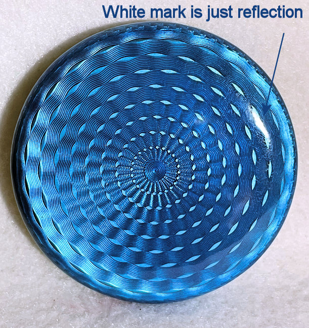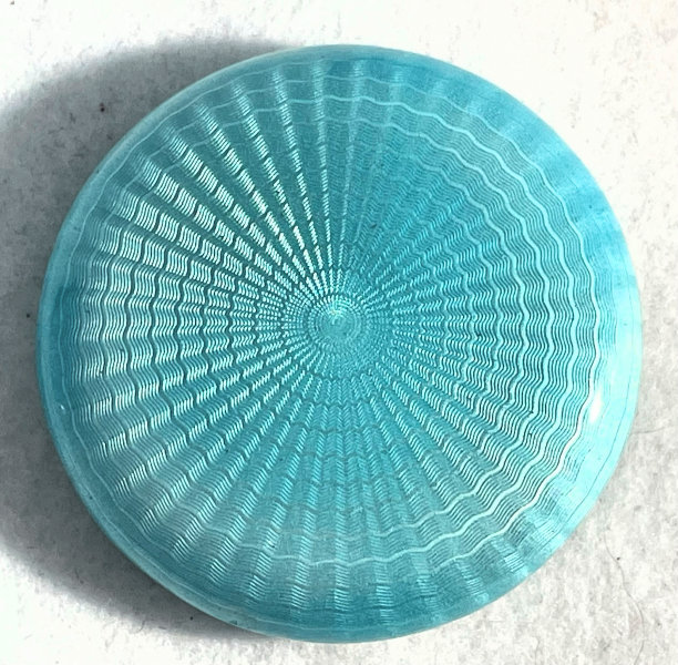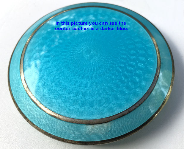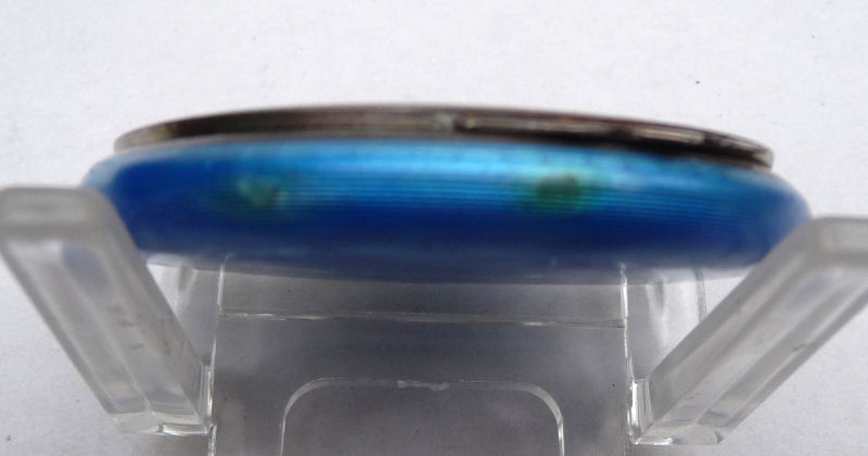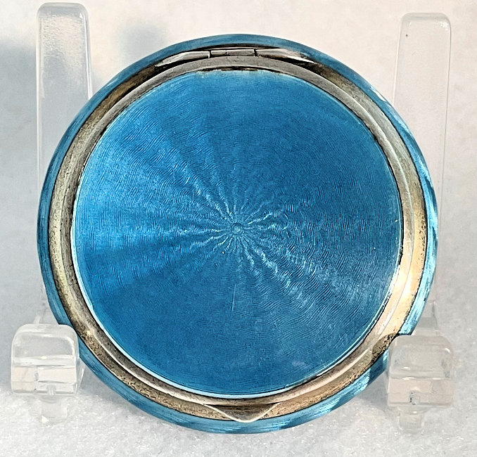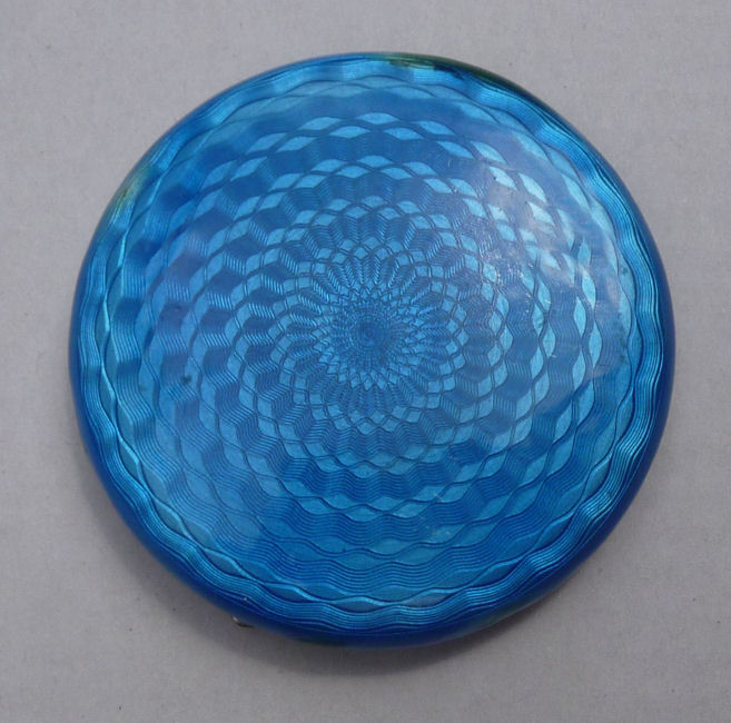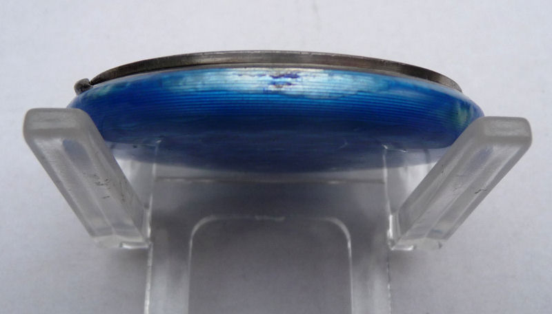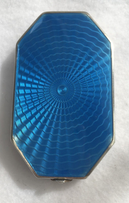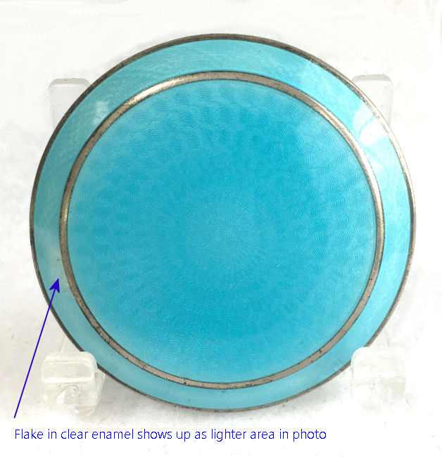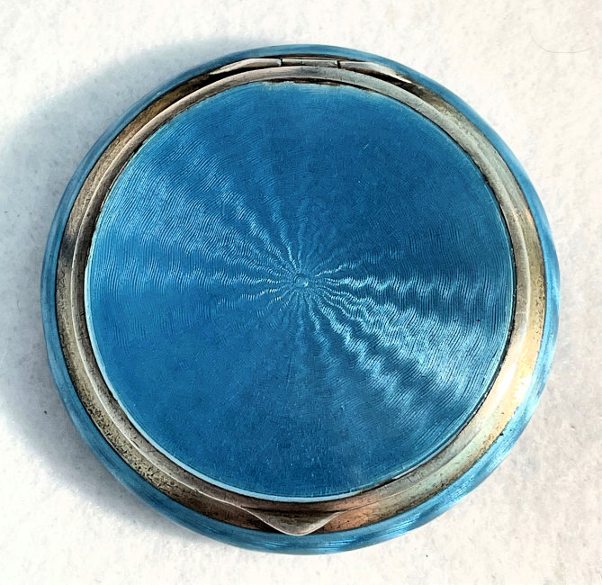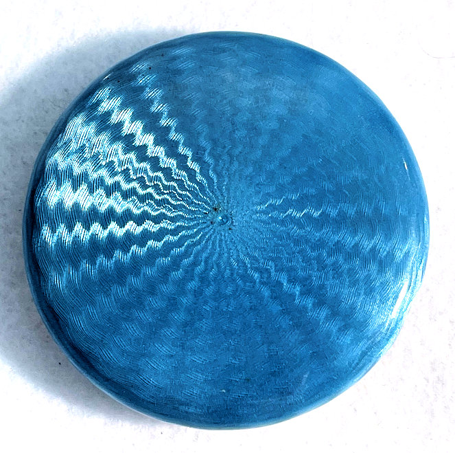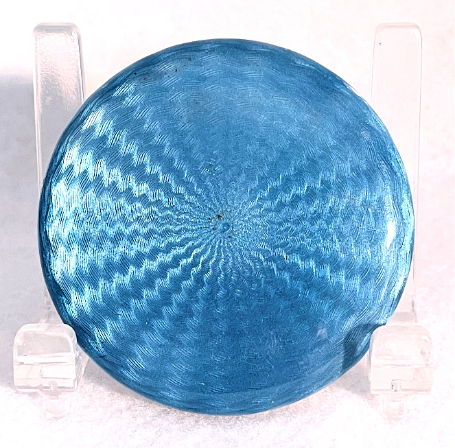 Here is a very pretty sterling silver compact completely covered in baby blue enamel guilloche. The interior features a mirror in the lid and a rotating powder well in the base. Although at a glance it appears to be perfect, upon close inspection you will find some issues. The side edge on the left has a very teeny ding in the enamel. And on the lid right below the hinge is a thin sliver of enamel missing (not even sure how this could happen). There is also a scratch on the bottom of the case. Other than that it is in very good usable condition and would be great for display. The guilloche designs radiate from the center and almost have a holographic effect. Very pretty! It bears hallmarks for Austria and 935 sterling on the rim of the lid. Measures 2" diameter. (Click on pic for more photos.) |