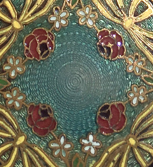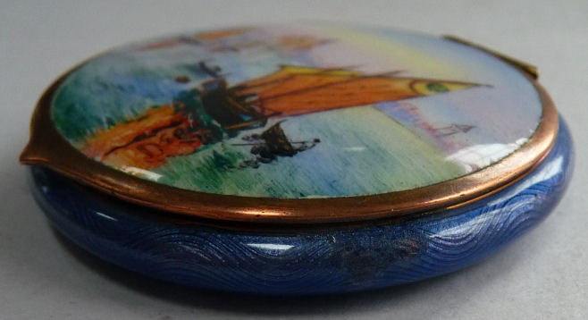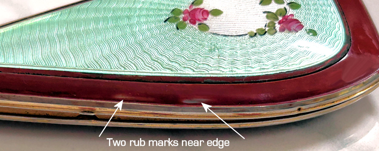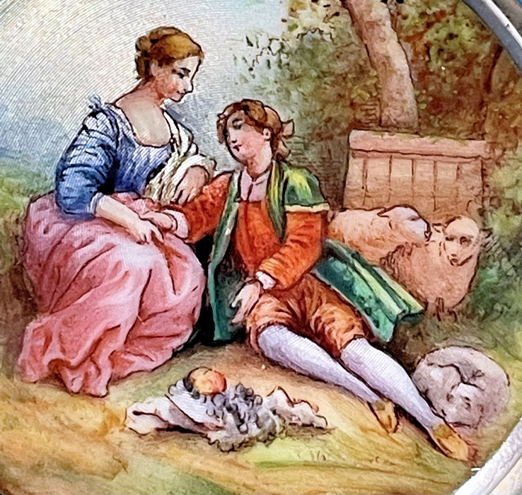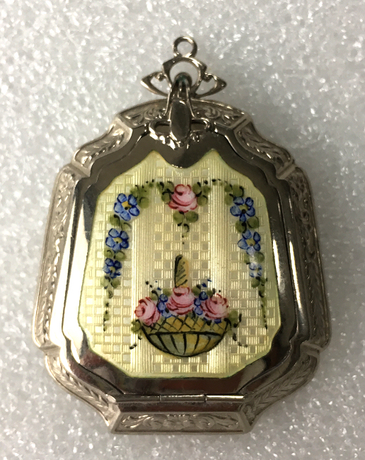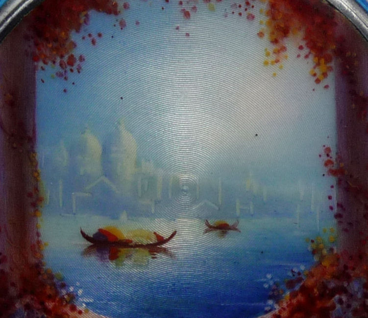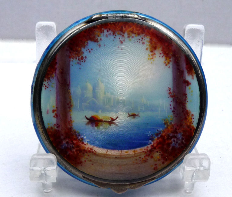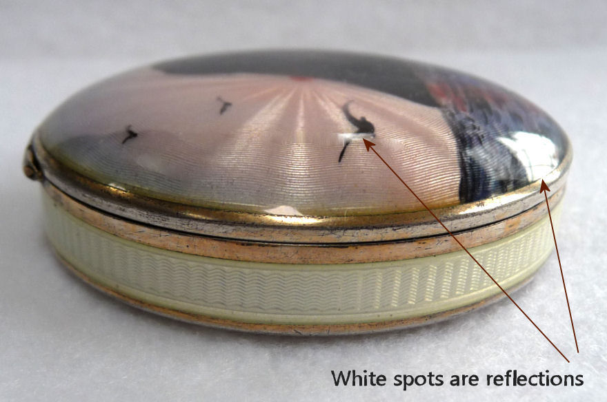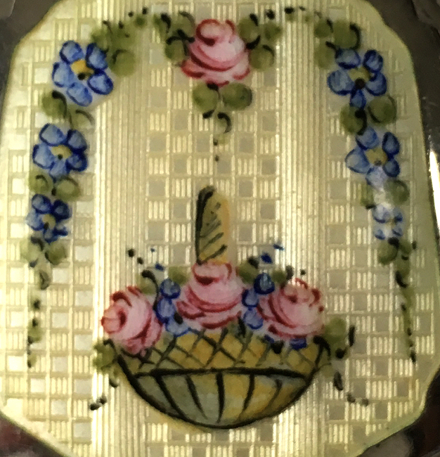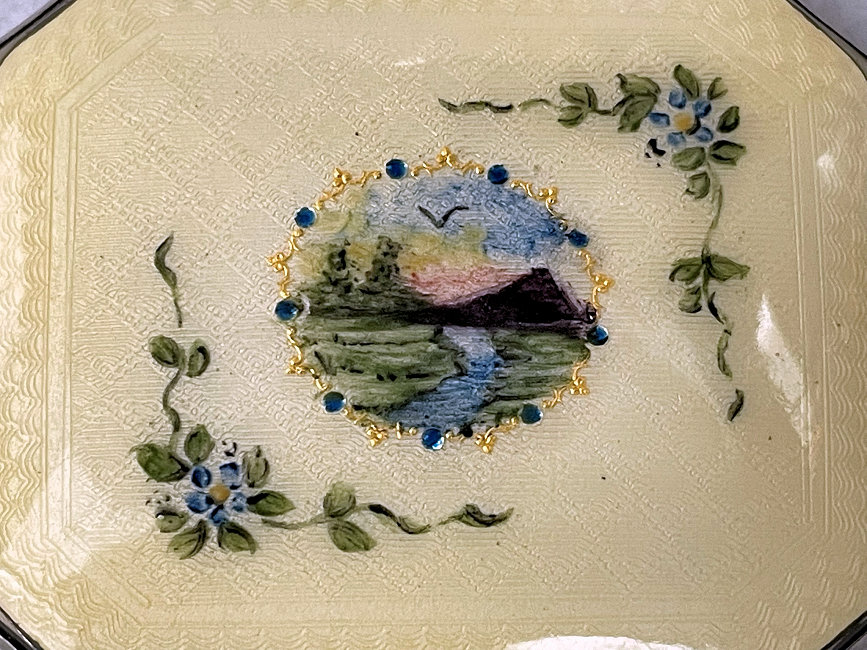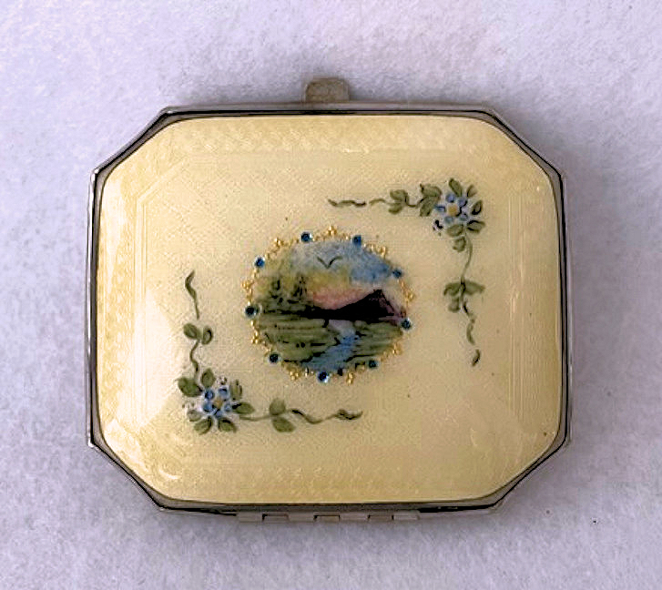 Painters who painted these compacts took artistic license and duplicated this famous painting with many variations and this is yet another example of this. The scene is beautifully done with subtle color changes in an enamel guilloche which literally glows. The painting on the lid completely covers it with no border at all. It is marked sterling silver on the rim of the lid but no maker's mark. Inside the lid is a mirror with and the bottom has a rotating sifter in gold. There are no makers marks. As for condition, the enamel on the lid is perfect and the bottom is perfect. However, on the edges there are several dings in the enamel, some of which have been inpainted by a previous owner and not that well. But since they are on the edge, they really aren't that noticeable from the top. The important thing is that the enamel guilloche scene is perfect! I have had this compact on display in my collection since 2002 and it was never an issue for me, particularly since the price was affordable at the time because of this and I am passing that along to you as well. In fact, I am asking exactly what I paid for it way back then! Please see all pics for close-ups of these areas. Measures 2-1/8" diameter. (Click on pic for more photos.) |