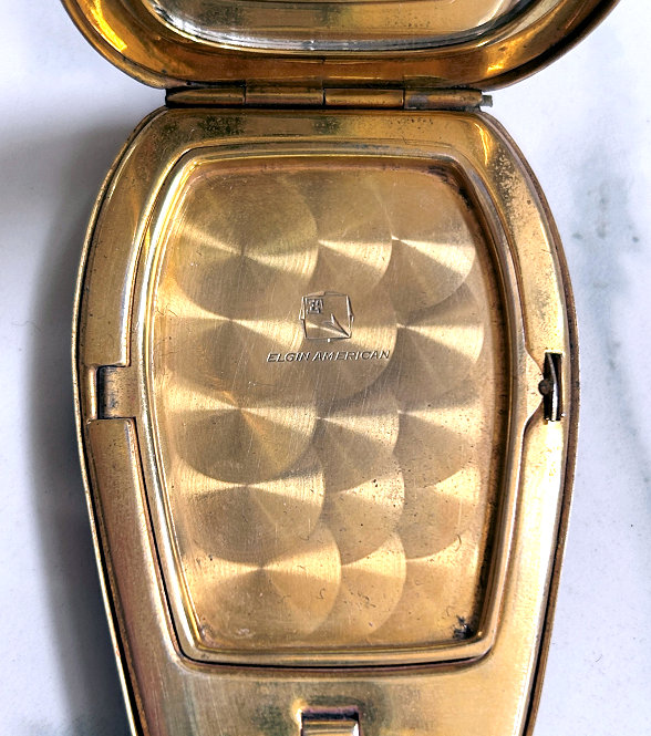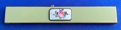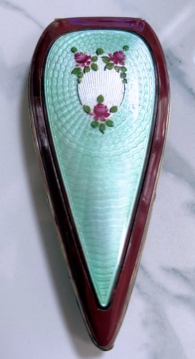 This is a very rare teardrop-shaped compact made by Elgin American. It has a very dramatic shaping and is done in plain brick red enamel with an almost full cover in mint green enamel guilloche with a white center vignette surrounded by three hand-painted pink roses. The compact has some minor wear around the edges as I have pointed out in the pictures and a small scratch that is visible when the light hits it on the enamel guillocheby the upper right rose. Other than that, it is in overall pretty great condition. Inside is a full mirror in the lid which is in great shape with only a couple of small foxing spots. The bottom holds a covered powder well and rouge pot. Inside the rouge pot are instructions how to order refills from Elgin for the mere price of 25¢. The back of the compact has one very small dent that is only seen when held at an angle to the light. Based on rarity of this compact, I purchased it years ago for myself and had no problem with these very minor apologies. It's a gorgeous compact and great for either use or display. Measures 2" wide x 4-1/2" high. (Click on pic for more photos.) |