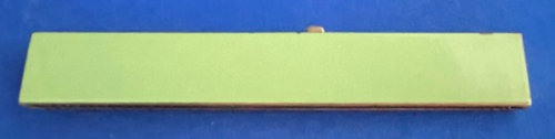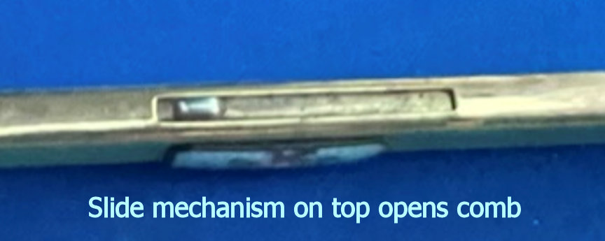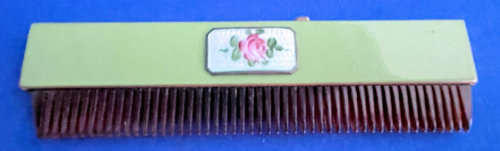 Even though this compact and comb were made by two different companies, they were together when I purchased them so I am basically including the comb for free. Both are done in plain enamel as well as enamel guilloche. The compact's lid is all baby blue enamel guilloche with gorgeous hand-painted roses. The rest of the compact is plain enamel and done in a gradient color that goes from light green at the edges to a light aqua in the center ... really pretty! The comb is plain green enamel with a vignette of a hand-painted rose on a pale blue enamel guilloche background. The compact was made by Evans and has a tap-sift for powder in the base with an original puff and a covered rouge pot in the lid. The cover of the rouge pot acts as a metallic mirror which is in excellent condition. The rouge inside appears unused. It is signed Evans TapSift in the base with patent numbers that date it to 1932. The comb retracts and was made by B.B. Co. dated April 25 192? ... I can't make out the last number but definitely from the 1920's. There is a slide mechanism on the top which extends the faux tortie comb ... very clever design and works well. Overall it is in good condition with myriad minor surface scratches that are visible upon close inspection but nothing glaring on the fronts. The back of the compact has a small flake in the lower right corner that unfortunately did not show up well in the photos. Again, not a big deal as it is mostly visible only when held at an angle to the light. Otherwise it blends in pretty well. The compact measures 2-1/2" square; the comb is 4-3/8" x 5/8". (Click on pic for more photos.) |