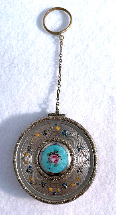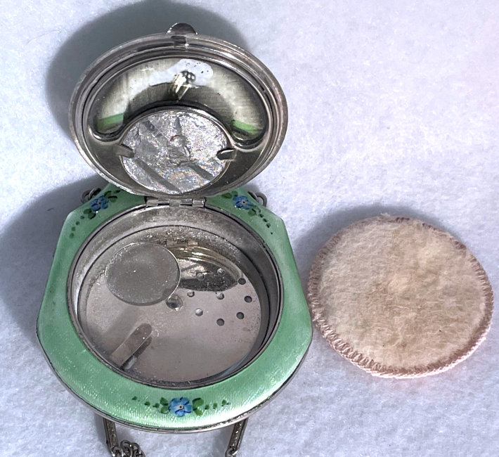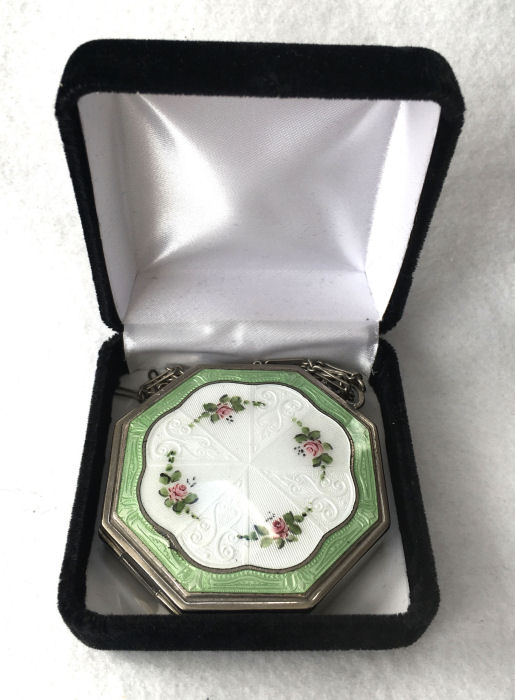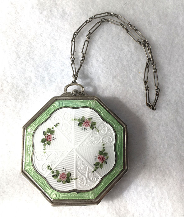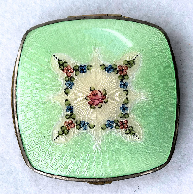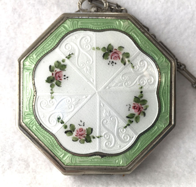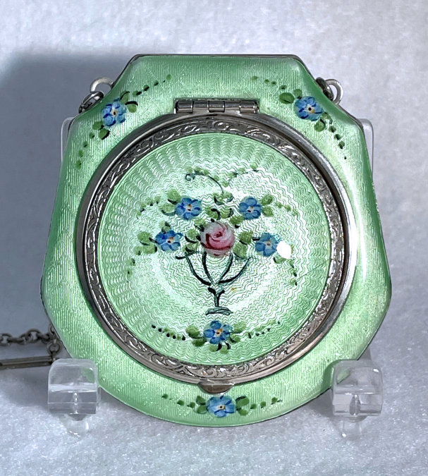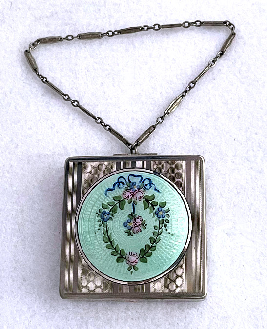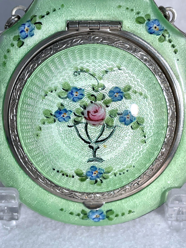 This lovely little compact has no maker's mark so I don't know where it was made but more than likely in the New England area as so many of these were. The front of the case is all done in very pretty mint green enamel guilloche with a hand-painted vase of blue forget-me-nots and a single pink rose on the lid and matching flowers around the edge. The back is done in engine turned designs on silver metal. Inside you will find a crescent-shaped mirror in the lid (has silver loss) with a rouge pot beneath (still with sealed rouge!) and a rotating powder sifter in the base with an original unused puff. The compact snaps together tightly and has a lovely embossed bar and link chain handle. Overall it is in excellent condition with only one scratch on the lid in the clearcoat which is extremely difficult to even see. Measures 2-1/4" wide x 2-3/8" high. Chain handle has 4-1/8" drop. (Click on pic for more photos.) |