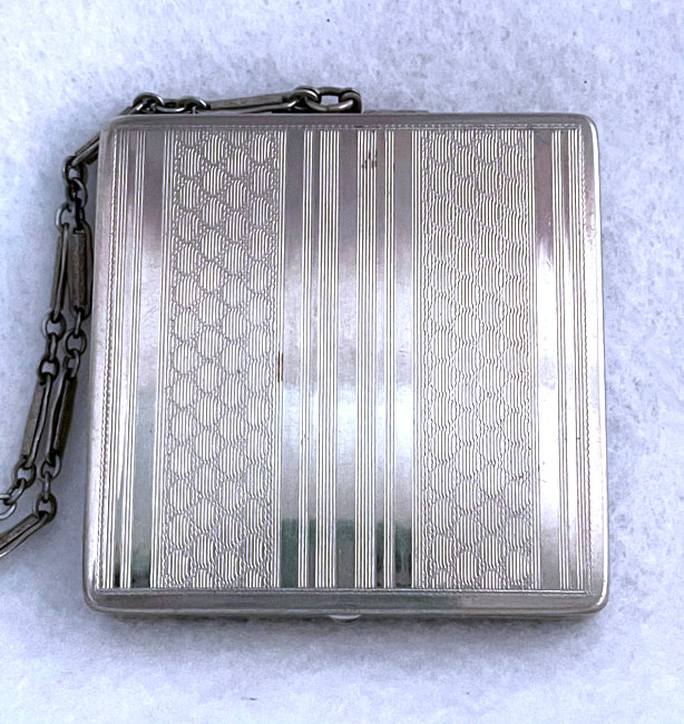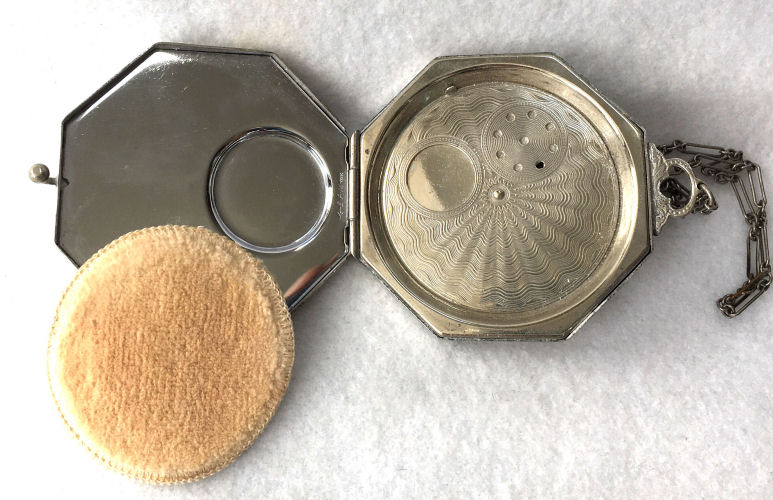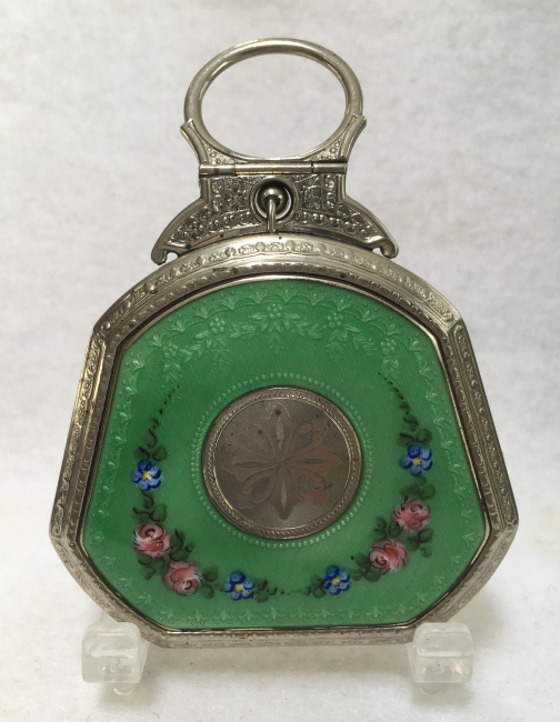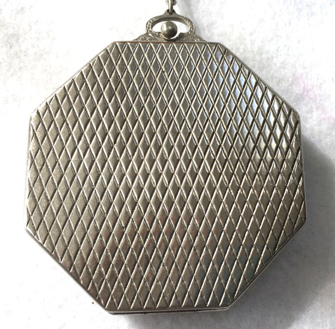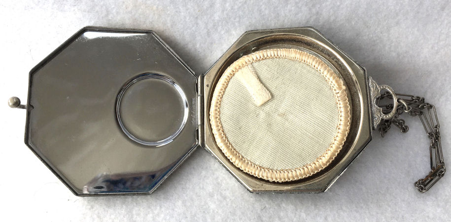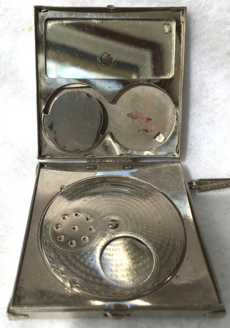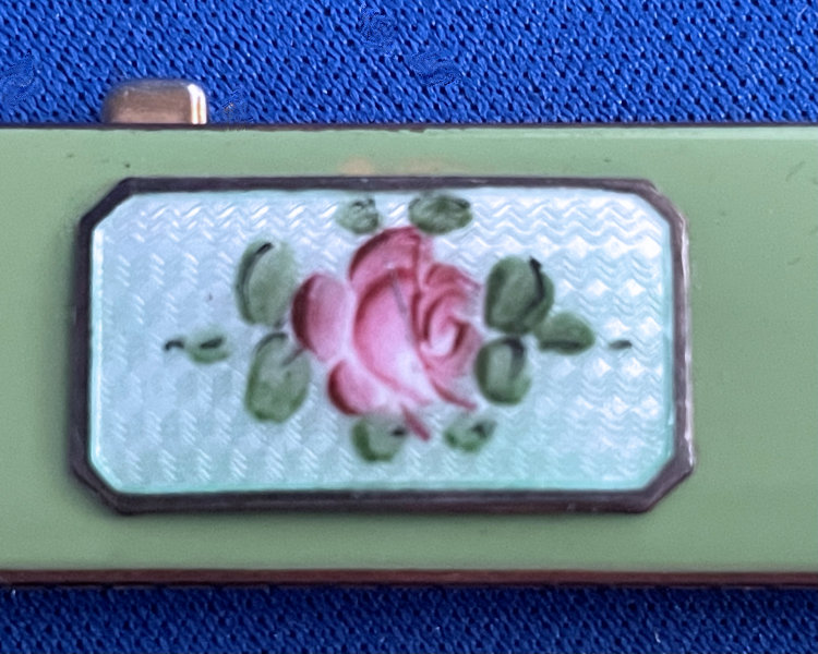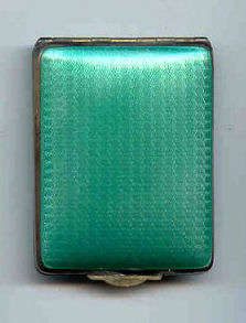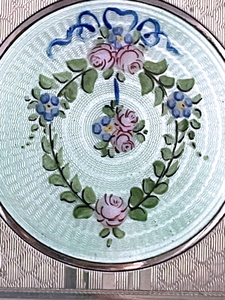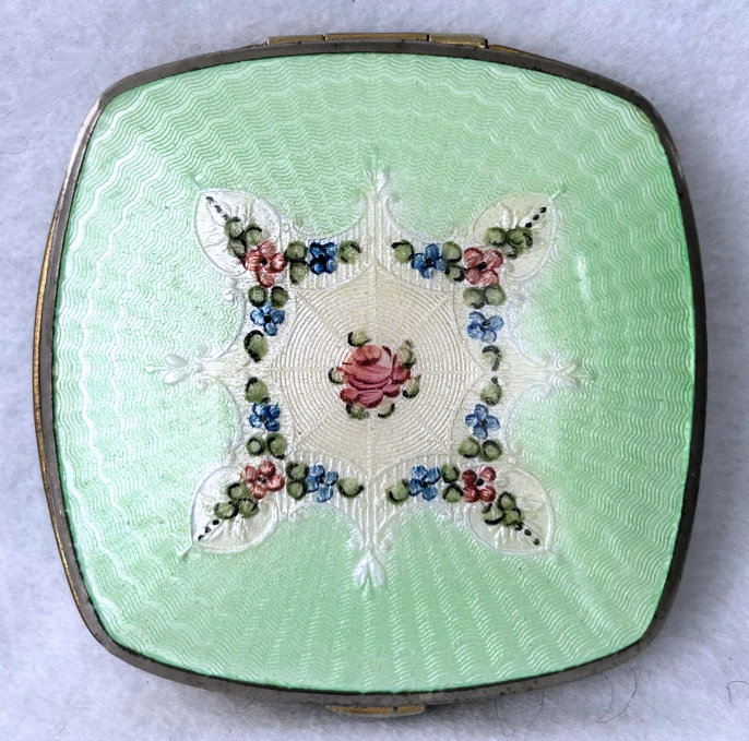 This lovely little compact has no maker's mark so I don't know where it was made but more than likely in the New England area as so many of these were. The front of the case is all done in very pretty mint green enamel guilloche with a hand-painted vase of blue forget-me-nots and a single pink rose on the lid and matching flowers around the edge. The back is done in engine turned designs on silver metal. Inside you will find a crescent-shaped mirror in the lid (has silver loss) with a rouge pot beneath (still with sealed rouge!) and a rotating powder sifter in the base with an original unused puff. The compact snaps together tightly and has a lovely embossed bar and link chain handle. Overall it is in excellent condition with only one scratch on the lid in the clearcoat which is extremely difficult to even see. Measures 2-1/4" wide x 2-3/8" high. Chain handle has 4-1/8" drop. (Click on pic for more photos.) |