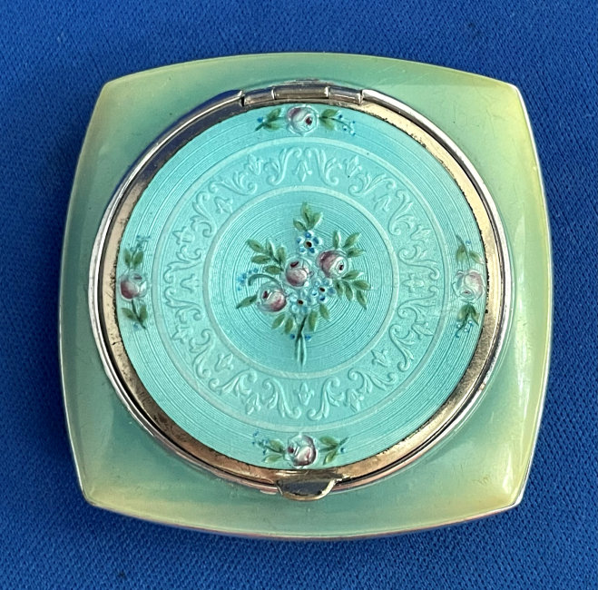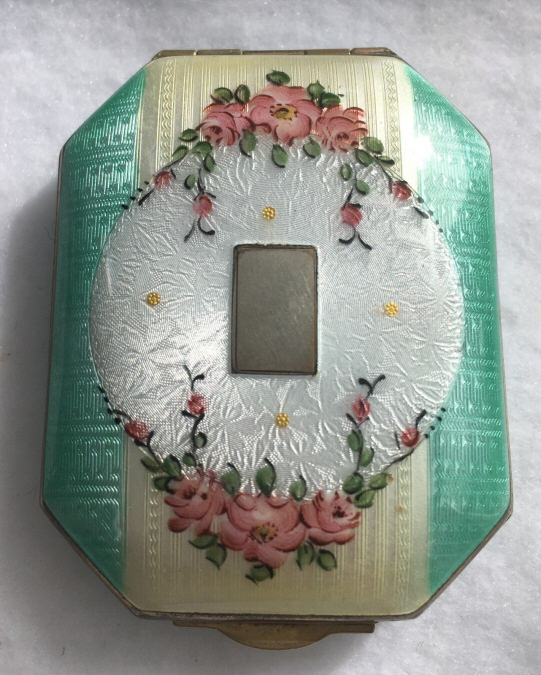 Here is a stunning compact made by F. M. Co. in a lovely aqua shade with cream accents and pretty roses. The back is solid aqua enamel guilloche. Interior is done in gold wash and has a covered powder well with holder for puff (included). The metallic mirror flips from side to side and reveals a rouge pot on the reverse side. Not marked sterling, but the outside edges tarnish and polish as if they are sterling. Marked F.M. Co. on the mirror hinge. Measures 1-3/4" wide x 2-1/4" high. (Click on pic for more photos.) |