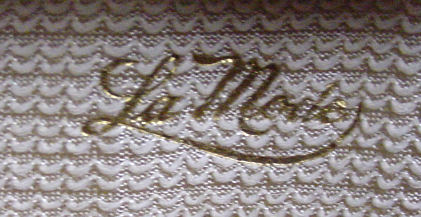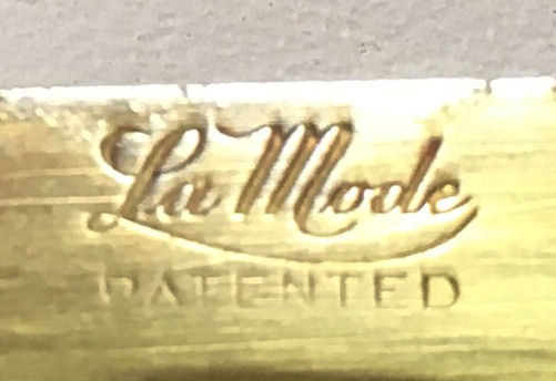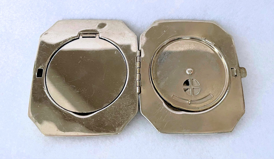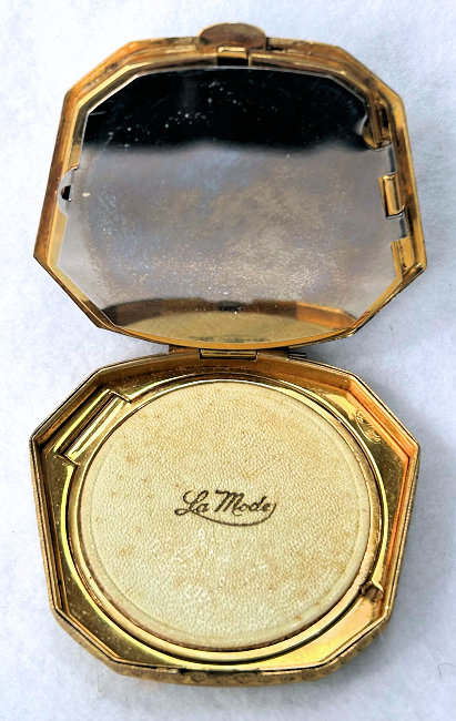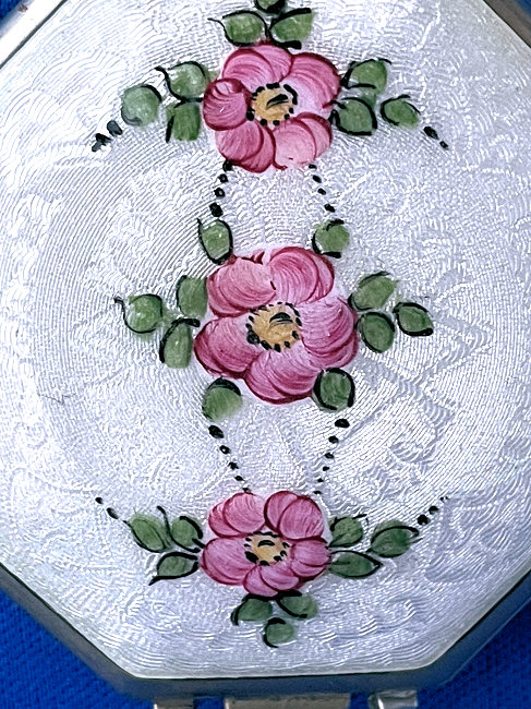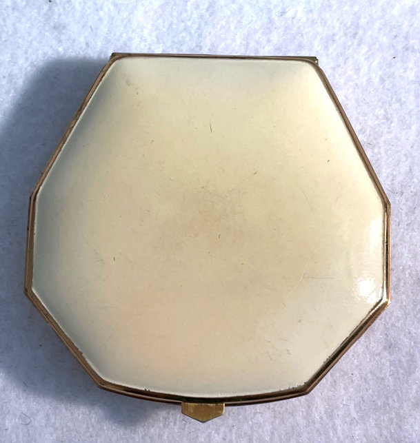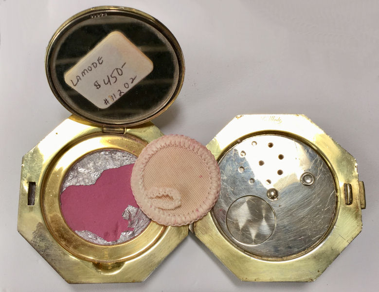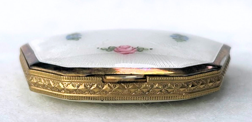 This is a very rare 8-sided shaped compact by LaMode in a beautiful enamel guilloche design on the top in snowy white with hand-painted pink roses and blue forget-me-nots.. Inside the lid you will find a covered powder pot in the base with an original puff and a reorder label from LaMode. The lid has a metallic mirror which is in very good condition which opens to reveal another original puff and a sealed rouge pot inside. The back of the compact is plain cream enamel in very good condition with no visible scratches or scuffs. The edges have a very pretty embossed design and the lid snaps shut firmly. Powder puff is signed LaMode and the company signature is on the powder well surround in the upper right corner. Compact is in mint unused condition. Measures 2-1/8" x 2". (Click on pic for more photos.) |