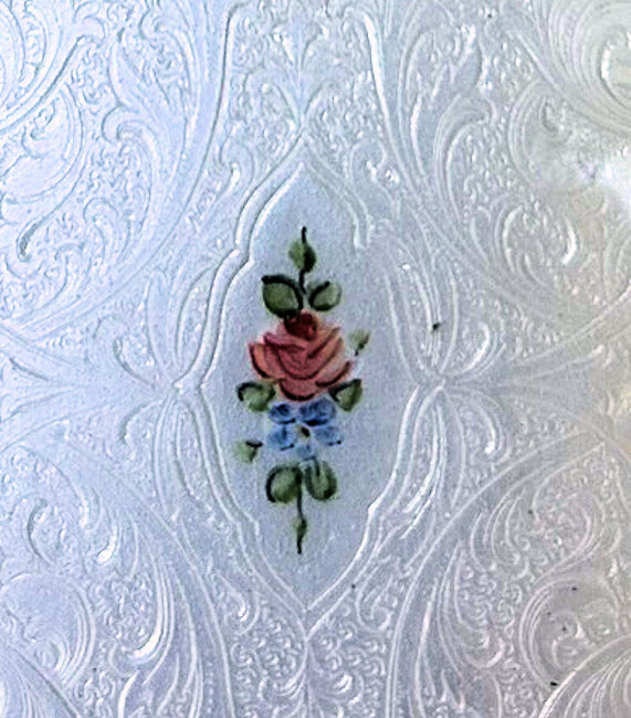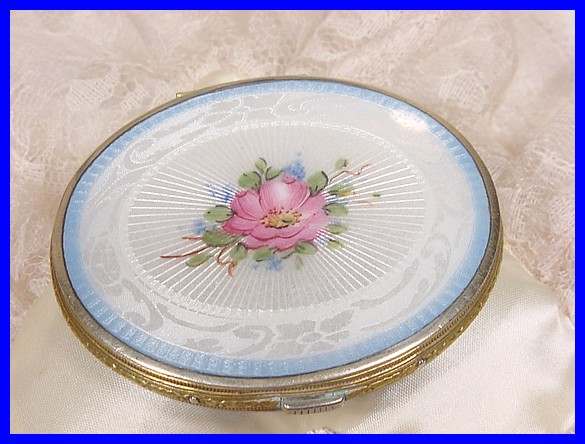 This is one of the prettiest Bliss Brothers compacts I have ever seen ... the front is a beautiful snow white enamel guilloche with a powder blue border around it and a center pink rose with tiny blue flowers. The back of the compact -- and this is unusual for Bliss -- is all powder blue enamel guilloche. Interior has a beveled mirror in the lid and a covered powder well in the base. Although the sticker is no longer inside, I know it is 22Kt gold overlay from other BBCo. compacts like this that I have owned. It is in excellent condition with only superficial scuffs visible when held to light. Measures 2-3/4" wide x 2-1/4" high. (Click on pic for more photos.) |