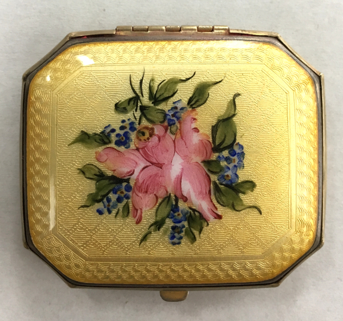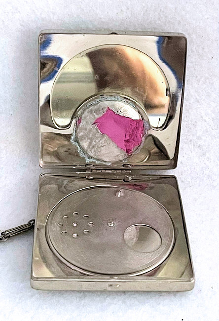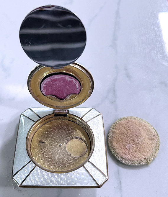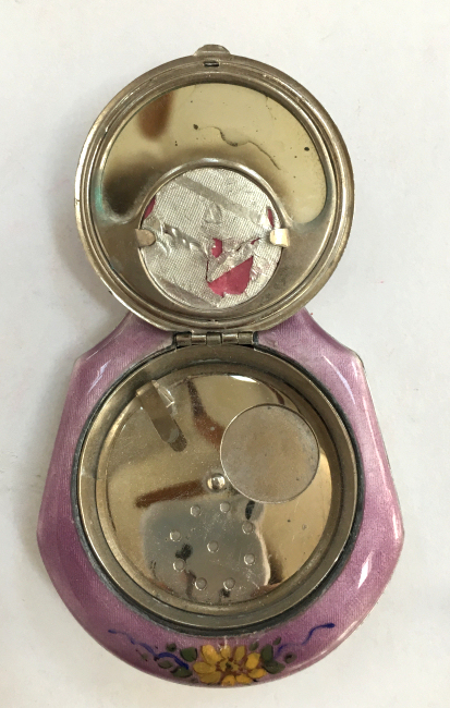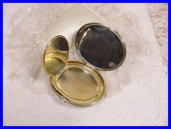 Here is a lovely double enamel guilloche compact with hand-painted pink flowers cascading down the center of the front. The outside is done in a snowy white ornate enamel guilloche on the front and the same design on the back minus the flowers. The interior of the compact is done in gold wash with ornate damascened design on the covered rouge pot in the top with a mirror on the reverse side. The bottom has a rotating powder sifter. It is in excellent condition. Marked R & G Co. on the inside rim and also Patent Pending. There is a name inside "Meta B Stewart" ... what an old-fashioned sounding name! Measures 2" x 2" (Click on pic for more photos.) |