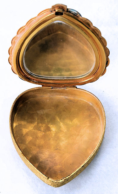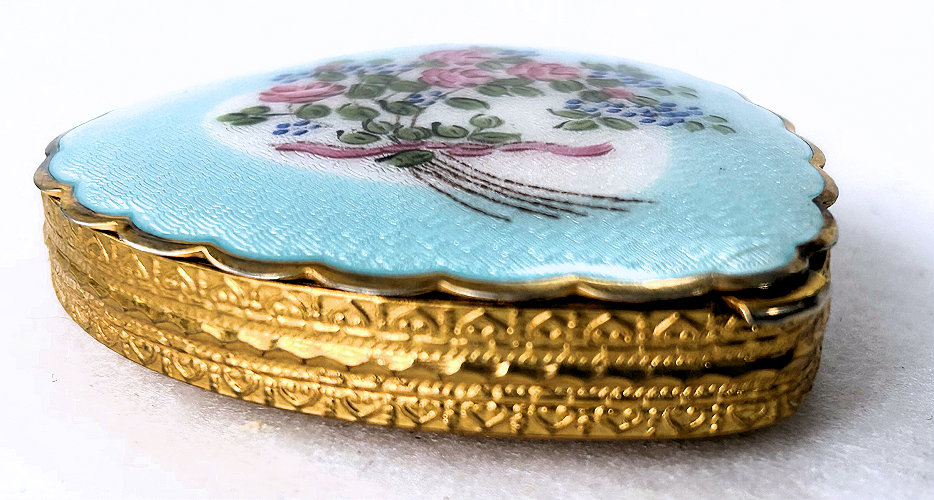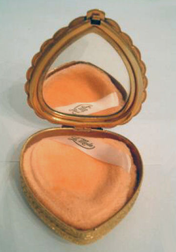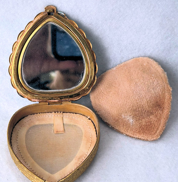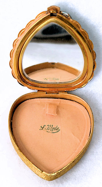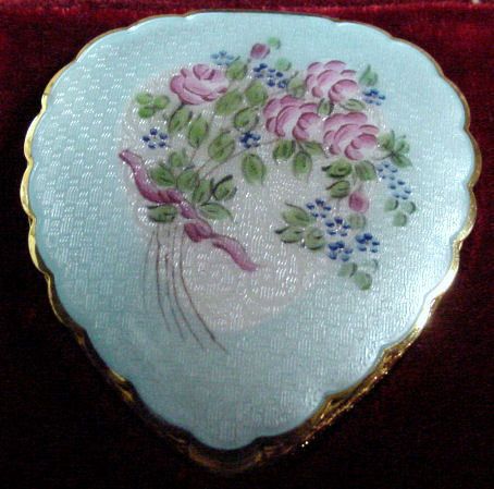 This is one of my favorite LaMode compacts because it is shaped like a heart and has the prettiest pale blue enamel guilloche on the lid with a center vignette of a bouquet of roses and blue forget-me-nots hand-painted on a white heart-shaped center. The lid is scalloped all the way around and the edge is very ornately embossed. Interior of the compact features a full mirror in the lid and the base has an original puff (used) and powder screen. It is signed LaMode on the lower rim of the mirror. It is in very good condition overall with some slight scuffing to the bottom from being stored. Compact measures 2-5/8" high x 2-3/8" wide x 1/2" thick. (Click on pic for more photos.) |