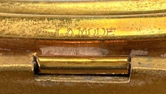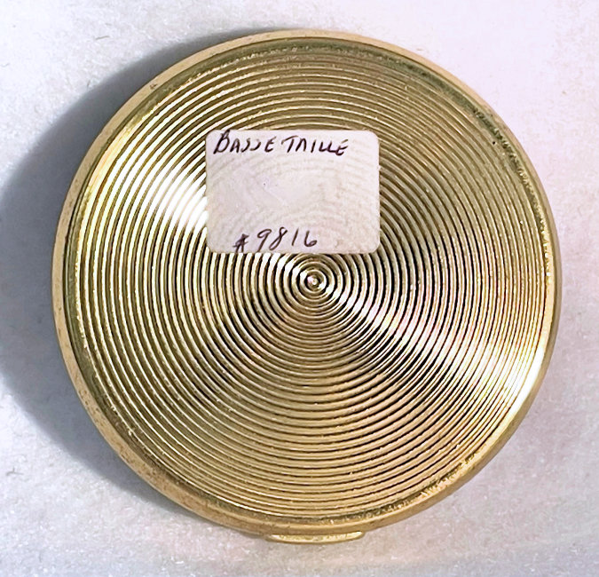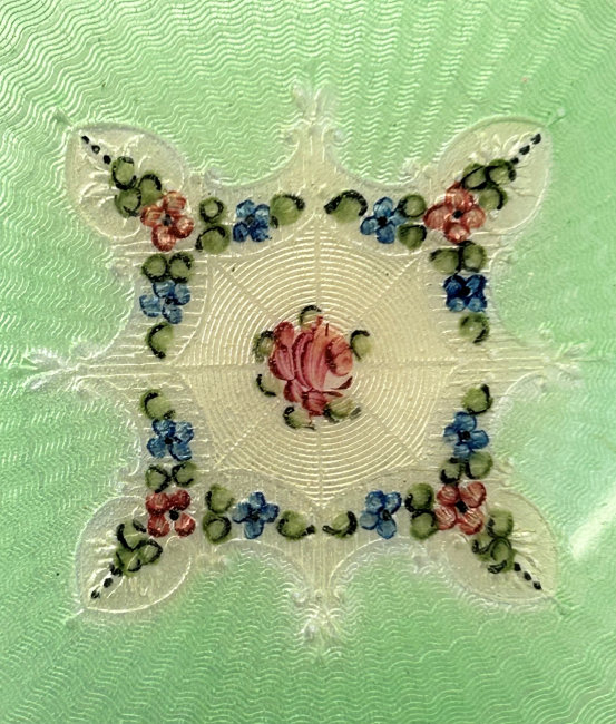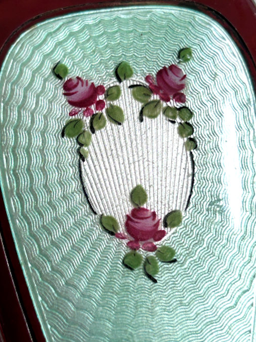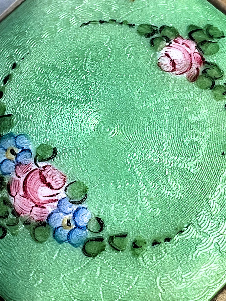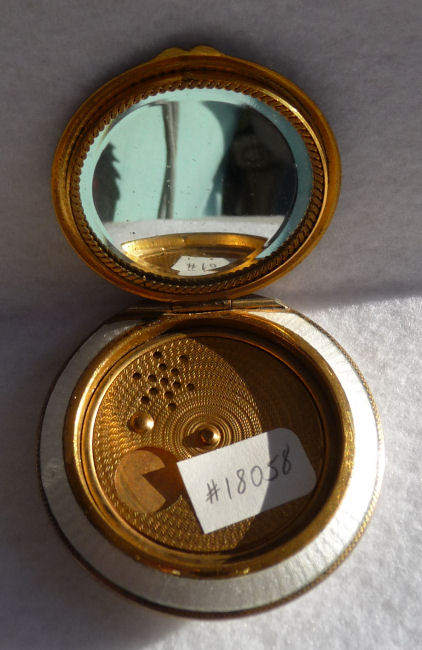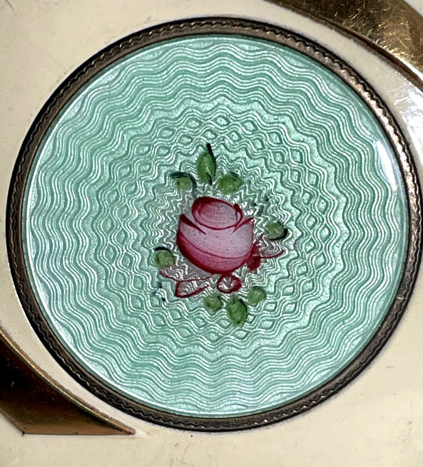 This is such a pretty compact made by LaMode in two different enamel techniques. First we have an outer green band in plain enamel (not guilloche), then a band of ivory enamel guilloche in a floral pattern, and then a center enamel guilloche done in green with hand-painted roses. It is very unique and very pretty! The back of the compact is done in a full green enamel guilloche in a very pretty design. The inside of the compact is done in gold wash and silver which is also very unique. There is a rotating sifter in the base for loose powder. The lid portion has a beautiful engine turned lid in gold wash which opens to reveal a mirror on the reverse side and a rouge pot beneath. The original puff and rouge pot are still inside. It is signed "LaMode" on the outer rim of the powder sifter on the gold portion. Measures 2" diameter. (Click on pic for more photos.) |