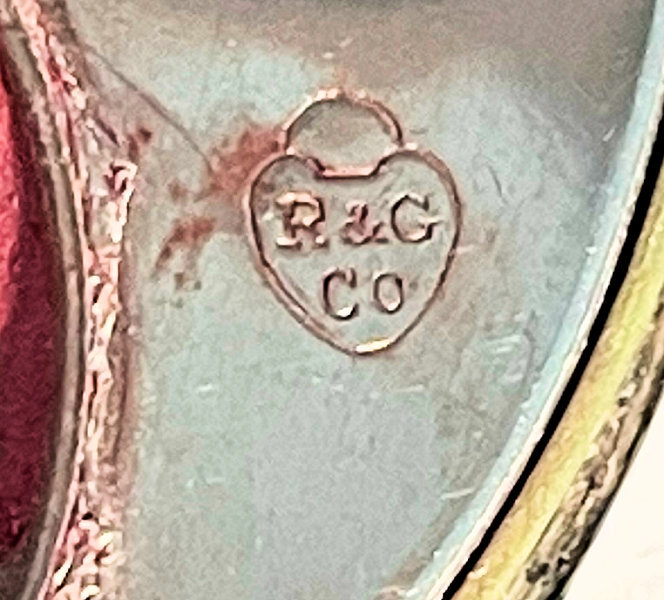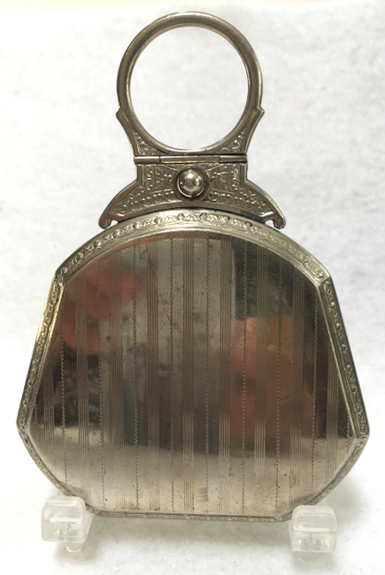 This lovely compact is attributed to R & G Co (Ripley & Gowan) even though it is unmarked. The design of the clasp and case is classic R & G design and I have had others similar which were signed. It is possible the signature is beneath an interior piece. In any event, this beautiful compact features a hand-painted flower basket with pink roses and blue forget-me-nots. There is also a matching cascading flower garland draping down either side. The background of the guilloche has two distinguishing designs in a striped effect: one stripe features checkers and the other is vertical lines. Very unique and pretty! The inside features a mirror in one side and a rotating powder well and rouge pot in the other. Both original puffs are still intact and gently used if at all. The compact is pretty much in mint condition and still retains rouge and powder inside. The back of the compact is richly damascened in beautiful designs which reflect the light at different angles (see photos). It is an exceptional piece throughout! Measures 1-7/8" wide x 2-1/2" high from top of clasp. (Click on pic for more photos.) |