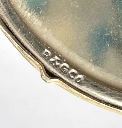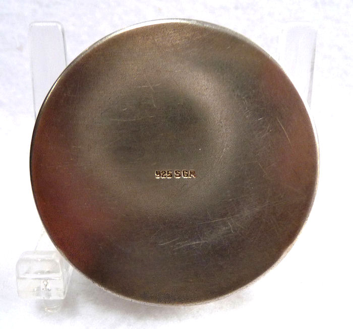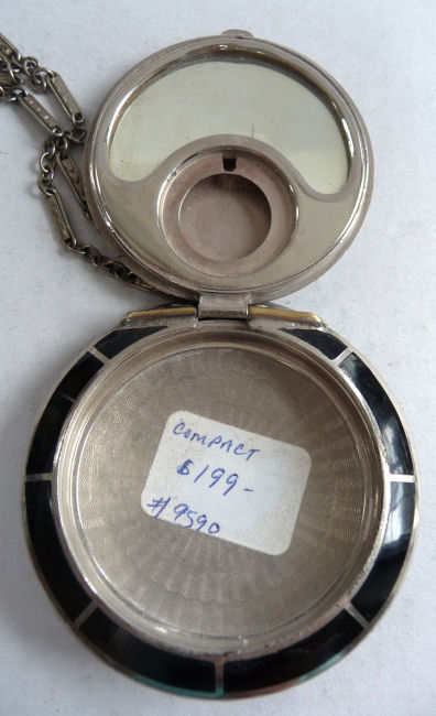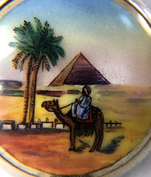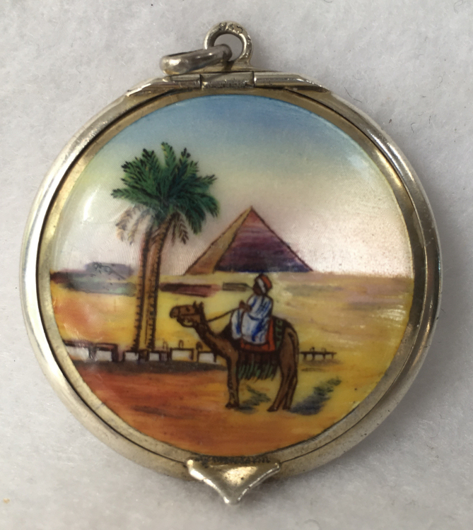 This is a beautiful sterling silver compact featuring a hand-painted scene of an Egyptian desert with camel, palm tree, sheik and pyramid in the background. Probably done in the 1920's when King Tut's tomb was found, this beautiful compact is in perfect condition! It is small enough to be worn as a pendant and has the soldered ring from which to hang a chain. I will include a new sterling silver chain to use with this lovely piece. The enamel scene covers the entire top and has an iridescent effect which is hard to capture in pictures. The inside features a mirror in the lid and a gold vermeil pot. The bail is marked 935 for sterling and the letters ASST which I am trying to research. . This entire compact is in excellent condition with no damage whatsoever. It is a rare beauty! Measures 1-1/2" diameter. Follow-up: According to Tom from Marks4Antiques.com, "Although these ASST initials are not documented and there are no official country of origin hallmarks on this piece, I am practically certain that it was made in Switzerland. I would also not be surprised if this was ordered by an upscale shop that catered to wealthy clients in Cairo or Alexandria, Egypt, during the 1920s - 1930s. As you know, it was around 1922 when King Tut's tomb was excavated, that sparked a period of special intrigue for American & European travelers that visited that country buying related mementos." (Click on pic for more photos.) |
