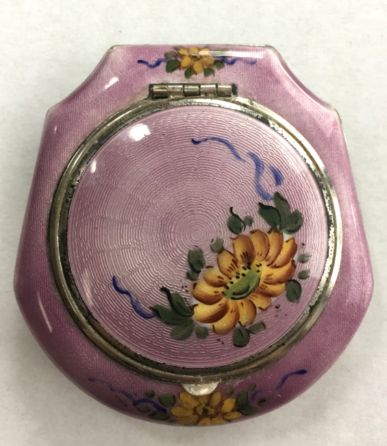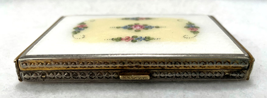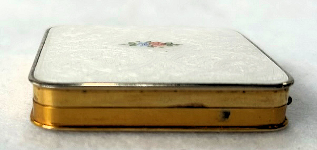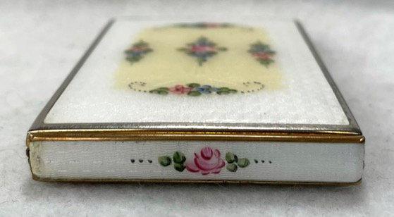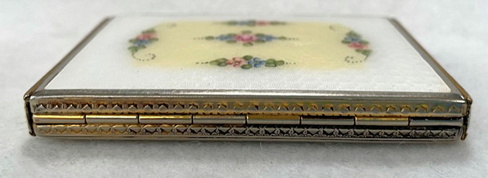 This little beauty is a rarely found design by F. M. Co. The background on the case edge and back are solid black enamel. The center of the entire top is done in white enamel guilloche with a pale yellow border around the edge. Inside the center and around the border are clusters pink, blue, yellow and purple flowers. It is truly beautiful! The inside is all finished in bright gold wash ... a double-sided mirror lifts up in the lid to reveal a sealed rouge pot. The base has a covered powder pot. Overall in good condition with surface scuffs commensurate with age ... nothing goes through the enamel is visible only when held to light. Measures 1-3/4" x 2-3/4" overall. (Click on pic for more photos.) |