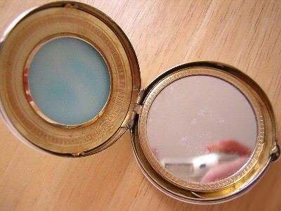 This beautiful little compact features a tranquil hand-painted scene in a center vignette surrounded by gold (more than likely real gold) and tiny embedded blue jewels. You can actually feel the little blue jewels! The scene is of a winding river and mountains with a beautiful sunset sky with a bird surrounded by an ivory background. The back of the compact is done in engine turned designs. Inside the compact, you will find a mirror with a rouge pot beneath and a rotating powder sifter to hold loose powder on the other side. The compact is in excellent condition. Measures 2-1/8" x 1-7/8". (Click on pic for more photos.) |