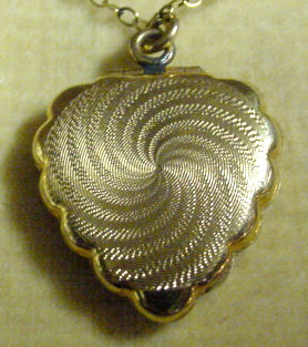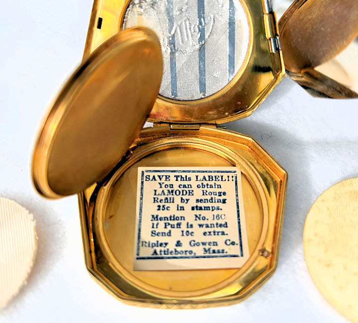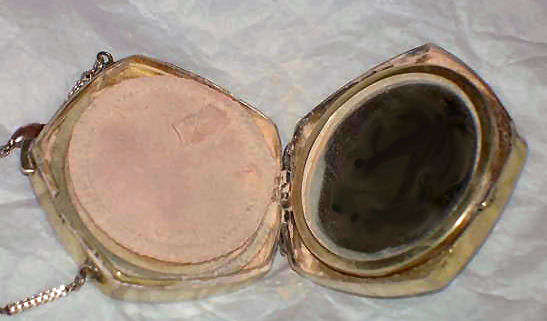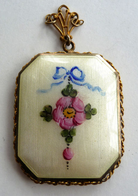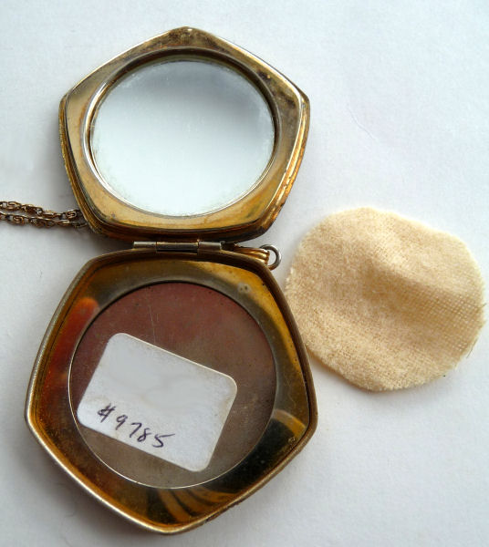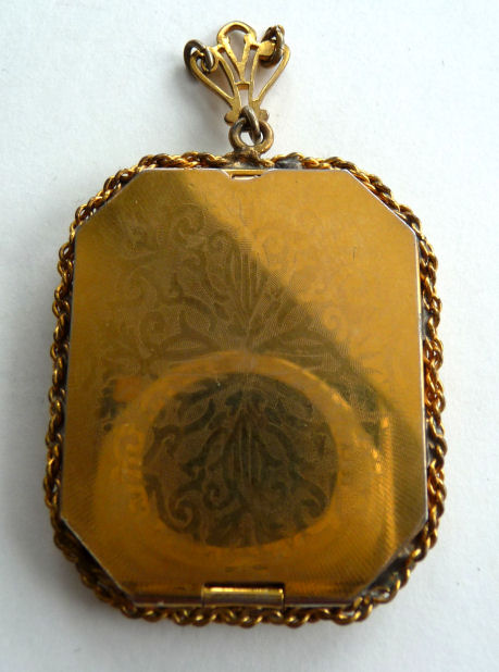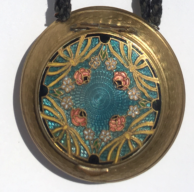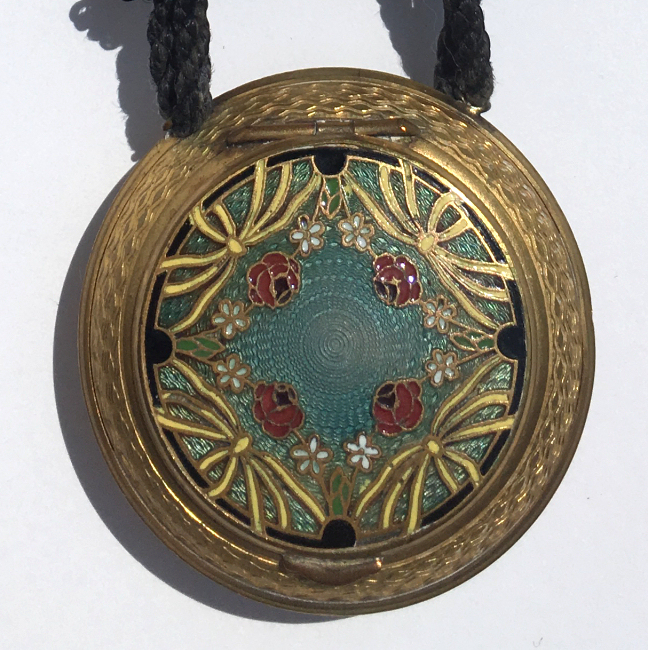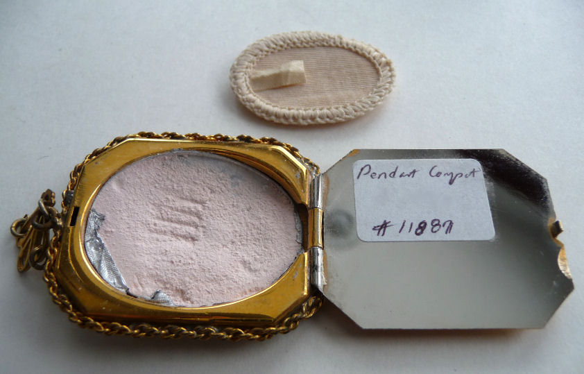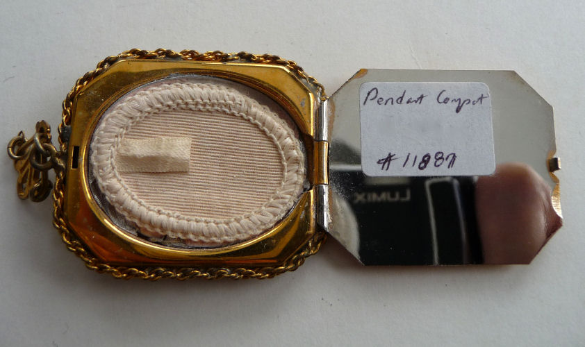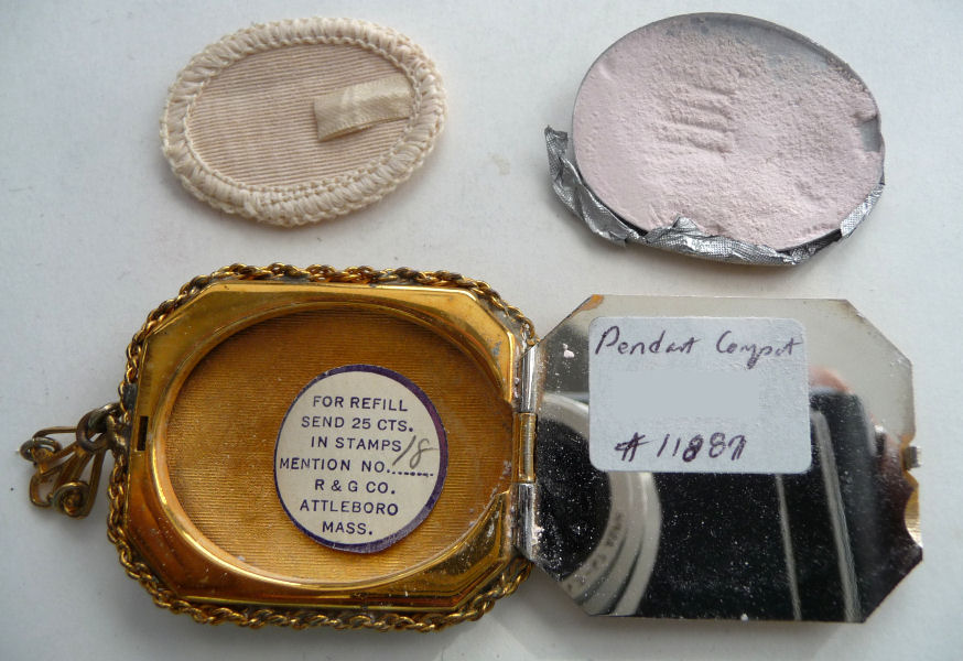 Very hard to find are these pendant compacts with full-front enamel guilloche, this one with a hand-painted ribbon and pink flower on ivory background. The back of the compact is damascened in a snowflake design, all on gold metal. And it is bordered with a lovely twisted rope in gold. The interior is absolutely adorable with the original oval puff and powder pot on one side and the metallic mirror on the other. The bail is original and has rings to attach a chain to each side (chain no longer with it). The powder pot is removable and beneath it is the original little reorder slip from R & G Co. of Attleboro, Mass. -- all for the low price of 25 cents in stamps! Now that certainly tells you how old this is :-) The enameling is all in excellent condition as is the entire compact. It measures 1-3/8" wide x 1-3/4" high. (Click on pic for more photos.) |