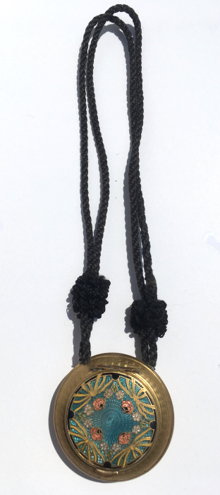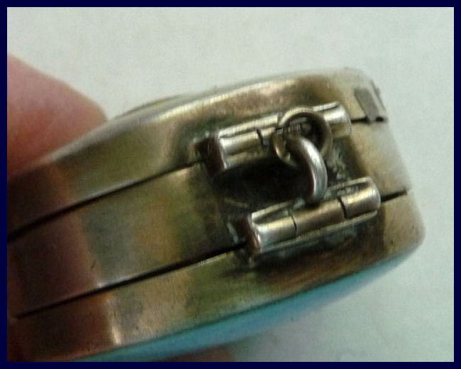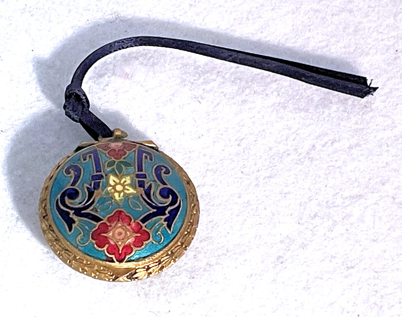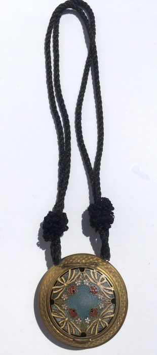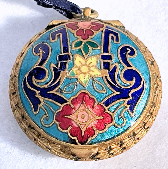 This is a gorgeous double-sided compact that I have had in my collection since 2004. I have always loved the unique design of this one ... it has teal blue enamel guilloche background on the top with cloisonné flowers and design and a teal blue enamel guilloche covering the bottom. There is a tiny ring to hang from a necklace or a chatelaine. Inside is an open powder well in the bottom and a full mirror in the lid with a pretty rope bezel retainer. The mirror is slightly fogged from age but still usable. While I could not find any maker's marks on this, it is reminiscent of others I have and have had that were made in France so I assume this is French as well. I would date this to the late 1800's or early 1900's. The base is probably brass or bronze and is embossed all around the edges as seen in photos. Measures only 1-3/8" diameter. (Click on pic for more photos.) |