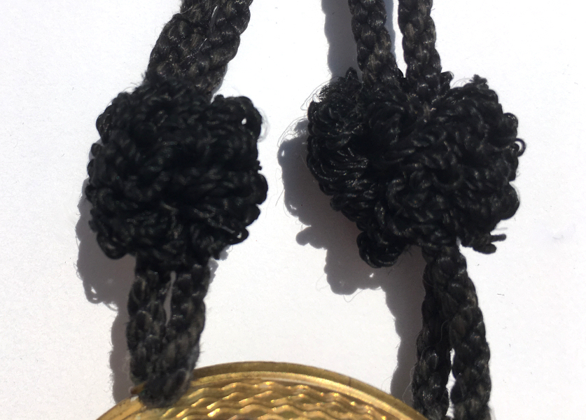 This is a gorgeous double-sided compact that I have had in my collection since 2005. I have always loved the unique design of this one ... it has teal blue enamel guilloche backgrounds on both lids with cloisonné roses and tiny white flowers and gold ribbons. The blues are slightly different on each side and the roses are a coral pink on one side and a darker red on the other. These slight variations in color would help the user to know which side holds what. Both sides have mirrors beneath the lids and both mirrors show significant clouding from age. The compartments are open for power or patches or whatever you wish to place inside. There is an original Made in France paper sticker still affixed in one of the compartments. The compact is suspended from the original braided silk cord with two fancy "knots" on either side. This is not removable. I would date this to the late 1800's or early 1900's. The enameling on the pink rose side is in perfect condition; the other side has some superficial scuffs visible when held to light but nothing noticeable at all. The case is gold tone and is either French bronze or a very good brass. It has engine turned designs all the way around. Measures 2" diameter x 5/8" deep. Braided handle is 7" long. (Click on pic for more photos.) |
