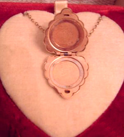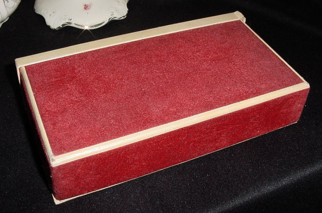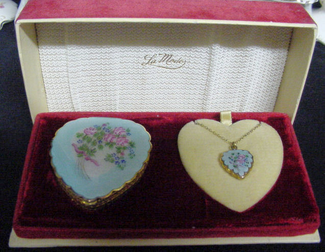 This is one of the nicest sets I have ever owned and it is literally MIB .. it has never been used! The red velvet presentation box is signed on the inner lid "LaMode" in gold script. Both pieces are a beautiful aqua blue enamel guilloche with a nosegay or pink roses and blue forget-me-nots. Lovely heart-shaped pieces are perfect for your loved one on Valentine's Day or birthday. Interior of compact has original unused puff and full mirror in lid. Compact measures almost 2-5/8" high x 2-3/8" wide x 1/2" thick. Locket is 3/4" x 3/4". Box measures 7" x 3-3/4" x 1-5/8" high.. The is a teeny bit of wear to the upper back right corner of box. (Click on pic for more photos.) |