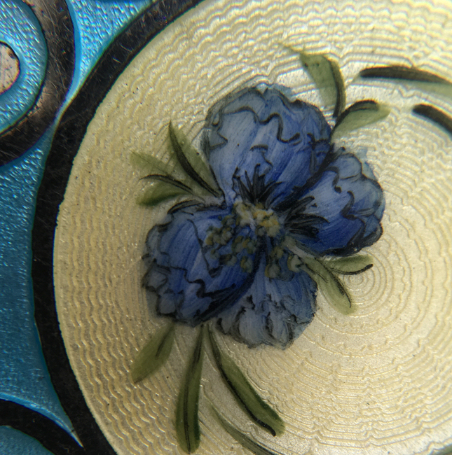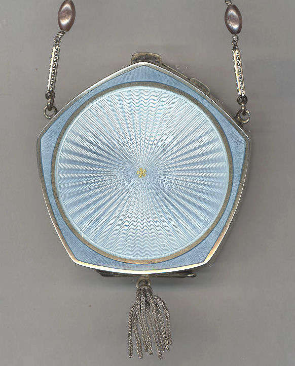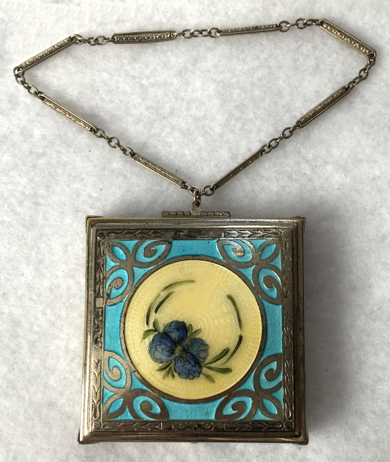 Here is a lovely little compact that has always been a favorite of mine because of the unusual design on the front. A center round vignette features an offset hand-painted blue flower on a creamy enamel guilloche backgroundThis beautiful compact has been in my collection for almost 20 years. I have kept it because it is an absolutely pristine example of an enamel guilloche. This is surrounded by turquoise blue enamel guilloche inset in champleve. The interior of the compact has a small mirror in the lid (some minor loss but still usable) and a place for a rouge pot and puff holder. The base has a rotating powder sifter with engine turned designs ... so pretty! The back of the compact is also engine turned and it is finished off with a bar and link wrist chain for easy carrying. It is in very good overall condition with no discernible damage, just normal minor wear from age use. The compact measures 2-1/2" square and the chain has a 4-1/4" drop. (Click on pic for more photos.) |