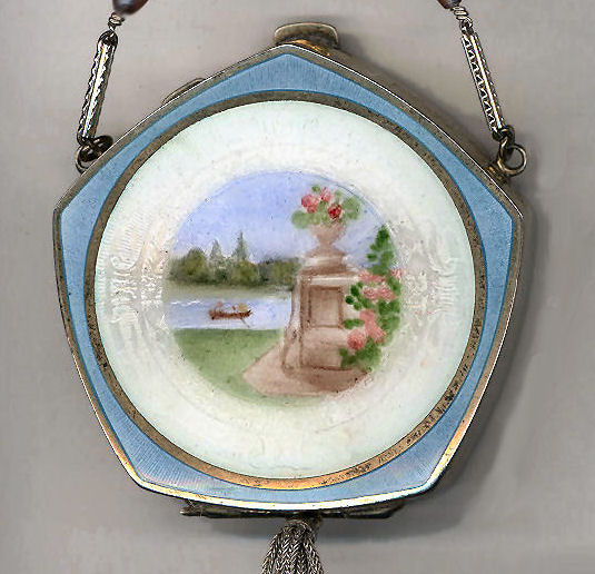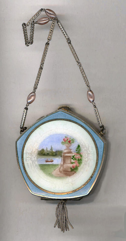 Another stunning sterling silver compact by the Thomae Co. (hallmarked on inside rim) ... this one comes from my own collection and is hard to part with. I particularly love the baby blue color and the pretty lavender pearls on the handle. The front has a lovely hand-painted scene on enamel guilloche in the center. The back is baby blue enamel guilloche with a tiny gold flower in the center and it is finished with a little metal tassel ... so cute! Interior has a rouge pot with puff on one side and a powder pat on the other with a double-sided mirror on a center hinge between the two halves. It is in exquisite condition. Compact measures approximately 2-1/4" x 2-1/4" not counting handle or tassel. (Click on pic for more photos.) |