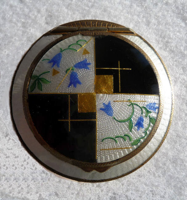 This is a beautiful enamel guilloche compact done in Art Deco influence ... it has four quadrants on the front alternating between solid black enamel panels with gold designs and white enamel guilloche panels with pretty bluebell flowers also with gold accents. The outer portion of the compact and the back are all finished in snowy white enamel guilloche. The interior has a mirror in the lid and a rotating powder sifter in the base all done in gold wash. There are no hallmarks anywhere but it is reminiscent of the fine Austrian compacts. It is possibly marked beneath the sifter but I was not able to pop it out to check so not sure of the origin. It is in excellent condition with no obvious damage anywhere, just very minuscule superficial scuffs on the base consistent with age. The compact is not flat but rather has a convex saucer shape when viewed from the side. Measures a bit over 2-1/4" diameter. (Click on pic for more photos.) |