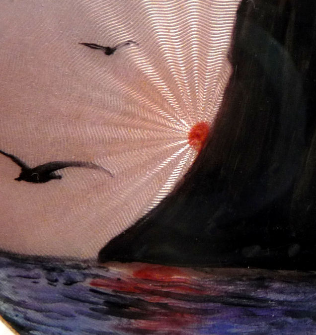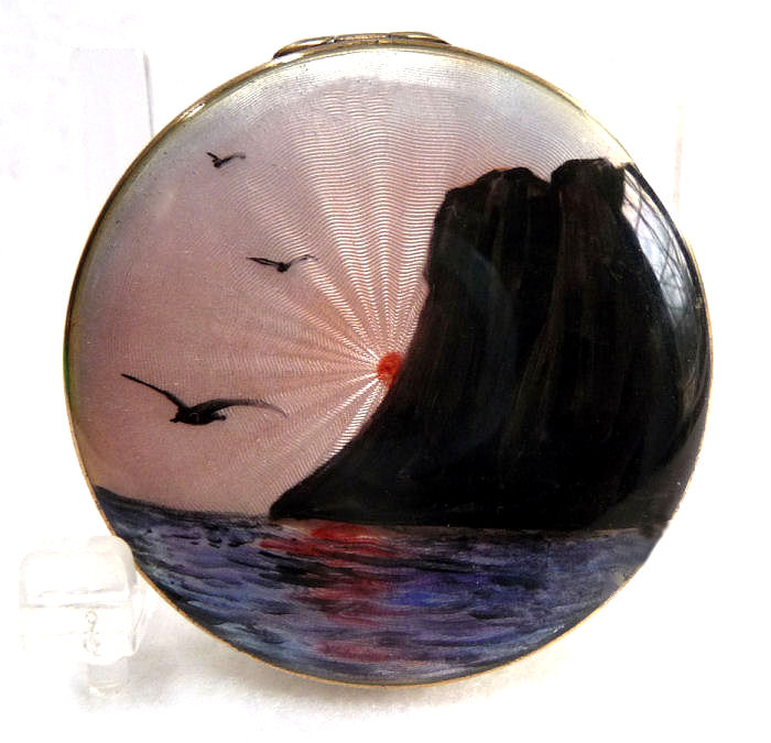 This gorgeous compact features a variant of Claude Monet's Cliffs by the Sea (or End of the Day) painting. The compact has a slightly domed lid and the scene covers it fully from edge to edge. The sene is of a sun setting behind a sea cliff with birds and ocean in the foreground. The sun is right in the middle which is awesome because the guilloche design radiates outward from the center and looks like the rays of the sun. This is reflected down in the water. The colors of the setting sun are iridescent and change when you move the compact which makes it like a hologram ... it is one of the prettiest I have seen. The sides are a soft creamy white enamel guilloche. Inside is a mirror in the lid and a maribou puff. The bottom of the compact is plain silver with the marks 925 SGR engraved in the center which denotes Gullringen A.S., an artisan's association in Sweden. The condition of the top is very good ... there is one scratch in the clearcoat right at the base of the cliff but it has to be held to the light to see it. It does not go through to the painting. Compact measures almost 2" diameter x 3/8" deep. (Click on pic for more photos.) |