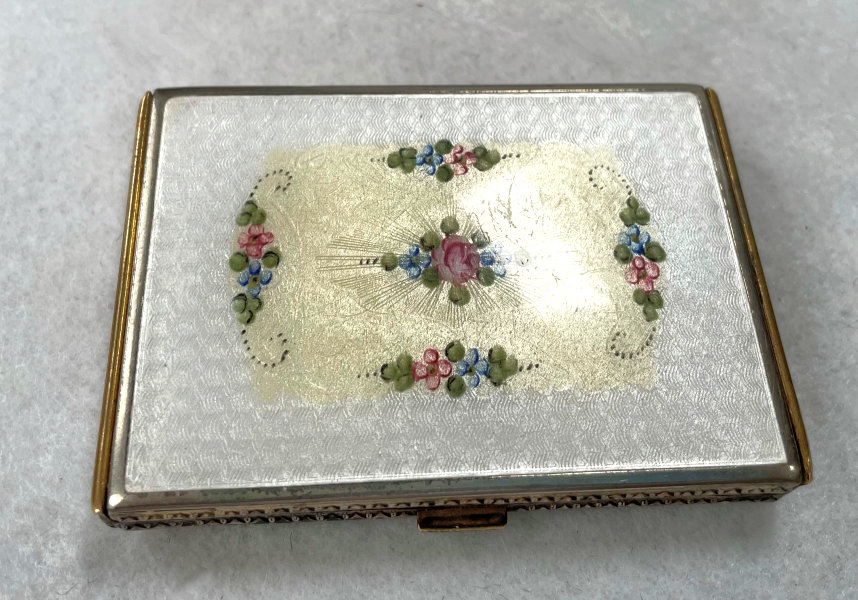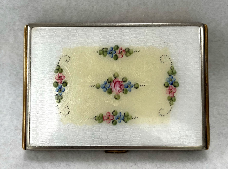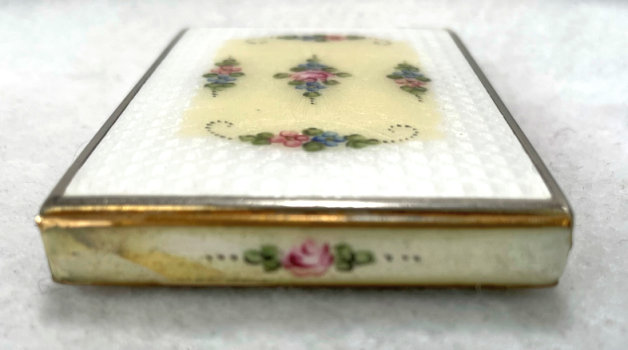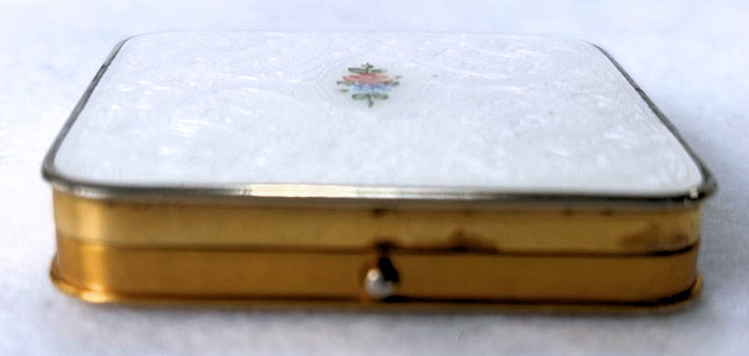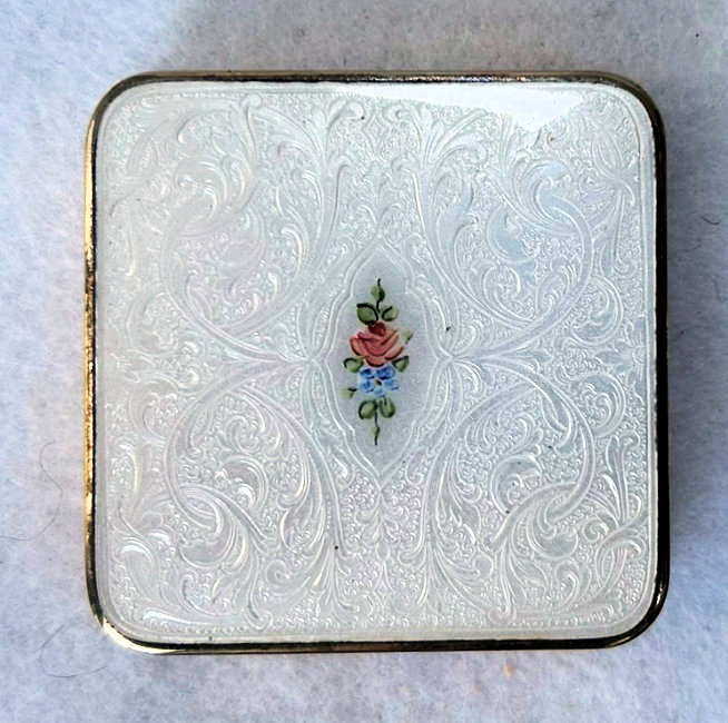 This is a truly gorgeous snowy white enamel guilloche compact with a center vignette on the lid of hand-painted roses and forget-me-nots. I purchased this for my collection many years ago and have always had it proudly displayed. It's bright white color makes it stand out in any collection. The interior of the compact features a rotating powder sifter in the base and a metallic mirror in the lid which lifts up to reveal a rouge pot with rouge still inside. I have looked all over and cannot find a maker's mark anywhere which is unusual. There is a pretty puff inside with embroidered flowers which may or may not be original to the piece. As for condition, it does have a few apologies that need to be mentioned although none of it was ever bothersome to me. On the top of the lid at the very edge, it appears to have a sliver of enamel missing which you can see in the photos. And on the back there is a slight discoloration at the top edge ... not damage, just an odd color that is in the enamel process itself. Based on that, the price is about half of what it would be if it were perfect. It is a very rare compact that I have not seen before and I have always loved owning it. The compact measures 2-1/4" square. (Click on pic for more photos.) |