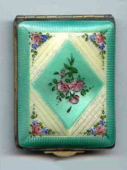 This is such a pretty little compact made by LaMode in a rare square shape. It features a palegreen enamel guilloche lid with hand-painted garlands of pink roses and blue forget-me-nots on a center vignette which is pale yellow. Inside the lid you will find a covered powder and rouge pot in the base with an original puff. The lid has a beveled mirror which is in fairly decent condition. The back of the compact is plain green enamel and has a four very tiny dents which didn't show up well in the photos they are so minute. The edges have a very pretty embossed design and the lid snaps shut firmly. All in all a very nice and usable compact. Measures 2-1/4" square. (Click on pic for more photos.) |