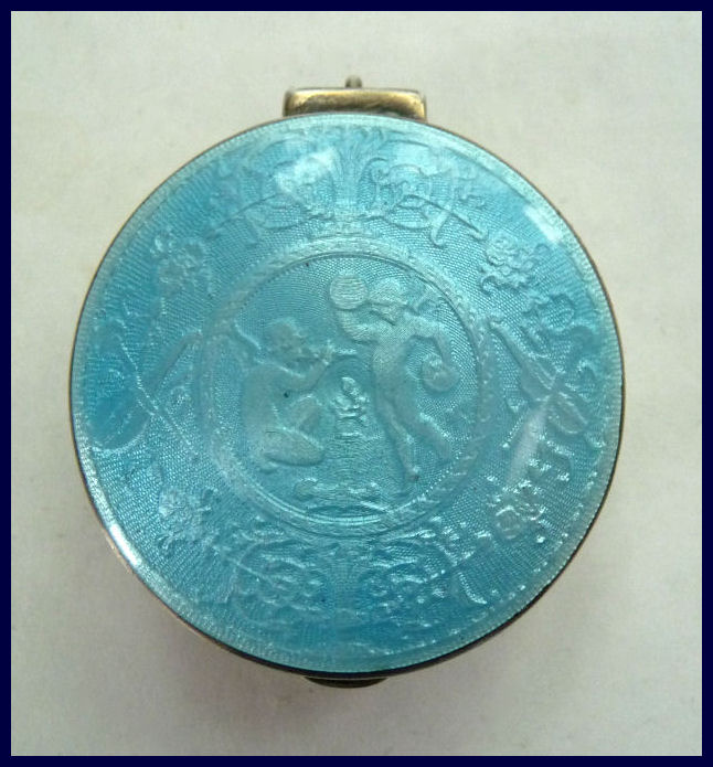 This beautiful enamel guilloche compact was made by R. Blackinton Co. and features two cherubs on the front ... one is playing a flute while the other has a pair of cymbals. The border even has musical instruments in the design. This is all done on a lovely sky blue shade of enamel guilloche. The compact is made in 2 sections. The topmost section opens for power and there is a place in the lid for a mirror. The retainer is still there but the mirror is gone (easily replaced). The bottom portion opens to reveal a spring-loaded compartment that would hold a dime (back in the day you could get a ride home for that coin!). There is a tiny ring on the top where a chain could be attached ... probably would have been used to add to a chatelaine at one time. The back side is plain solid silver with no enamel. It is a lovely compact and is in very good condition with no damage to the enamel. Measures 1-3/8" diameter x 3/4" deep. (Click on pic for more photos.) |