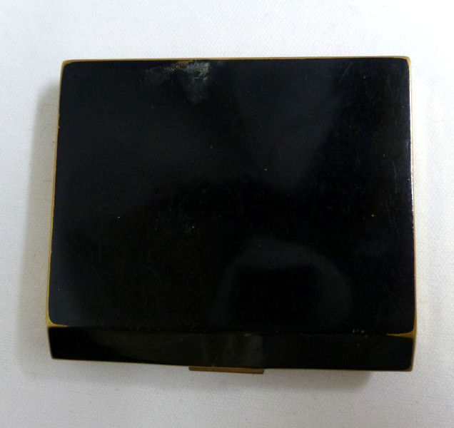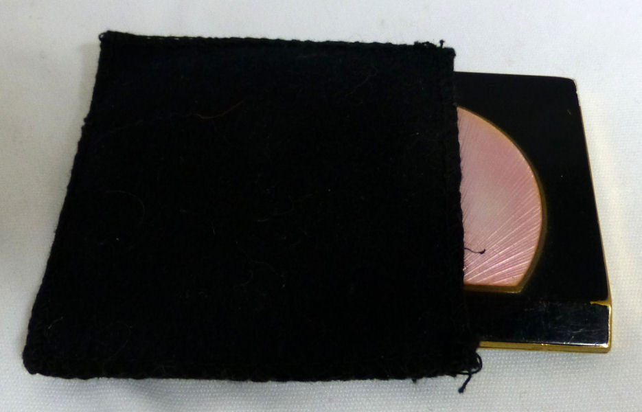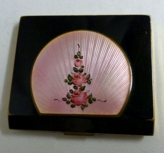 Here is a very pretty black and pink enamel guilloche compact with hand-painted roses on the front. The front edge beneath the pink angles downward toward the latch. Upon opening, the interior has two covered compartments for rouge and powder (original used rouge puff still inside). The mirror in the lid is beveled and is in very good condition. The black enameling on the exterior of the case is not guilloche but smooth and does have some wear mainly on the back side (unfortunately this was very hard to capture with camera as it is more smudges and loss of gloss as opposed to color loss). This might polish up but I have not tried it yet. Comes with black felt sleeve for storing. Compact measures almost 2-3/4" x 2-1/2". (Click on pic for more photos.) |