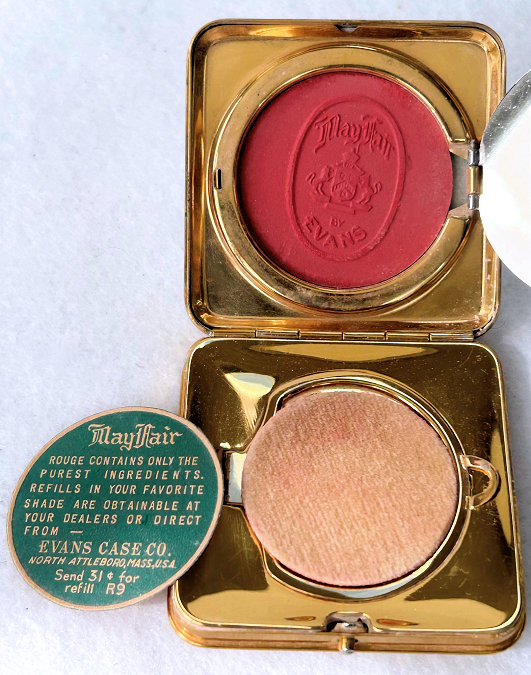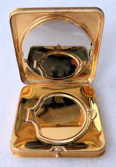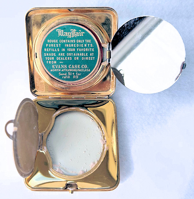 This is a truly gorgeous and rare square-shaped Evans compact with a full edge-to-edge snowy white delicate enamel guilloche design on the lid with a tiny single hand-painted rose in the center. The design in the guilloche is about the prettiest I have ever seen. Be sure to view the close-up! The rest of the case is brass and the interior is bright and shiny and in mint condition with a covered powder well in the base, a metallic mirror in the lid, and a rouge pot beneath that. The rouge has the original puff, reorder instructions from MayFair paper, and MayFair embossed logo on the rouge so it has never been used. The top of the compact is in mint condition; however, there are a few dark spots on the front and side edges and the bottom. The compact measures just a tad over 2" square. (Click on pic for more photos.) |