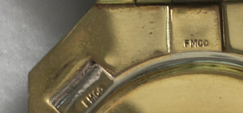 Finberg Mfg. Co. (FMCo) was known for their extraordinary quality enamel guilloche lady's vanity items in the early 1900's. This piece is a superb example of one of their beautiful hand-painted compacts. "Guilloche" refers to the designs beneath the enamel which are engraved into the base metal.This compact has three different guilloche designs on the front alone! Be sure to look at the close-ups to see what I am referring to. The centermost portion is white with tiny gold dots and a space for a monogram (it is blank). Then above and below are to bands of pale, pale buttery yellow with pink roses on either end. These hand-painted roses trail tiny rosebuds into the white section. The sides are banded in a soft pale aqua green shade which is just beautiful. When you look at the close-up, note the different patterns in the guilloche which shows through the colors making contrasting designs. So pretty! The back of the compact is also pale aqua green enamel guilloche (hence the term "double enamel guilloche") in two different designs (there is a border in a contrasting pattern). Inside the compact, you will find a mirror in the lid which lifts up to expose a rouge pot with puff tucked beneath. In the bottom portion you will find a covered powder well. It is signed FMCO in two places in the bottom (see close-ups). The interior is all done in gold wash and is in excellent condition. The outside of the compact is in excellent condition as well with no damage to the enamel whatsoever. It is about as perfect as you will find for an item of this age! I forgot to mention the compact is "pillow shaped" which means it is curved around the edges and fits comfortably in your hand. Measures 2-1/4" x 1-3/4" not counting clasp. (Click on pic for more photos.) |