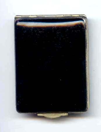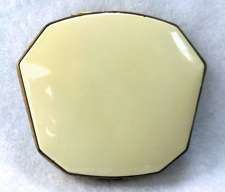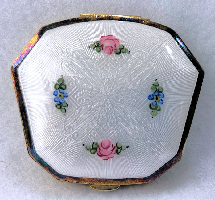 This is a very pretty compact that I have had in my collection for several years. It has white enamel guilloche on the top with a center vignette of pale yellow with hand-painted roses. The sides are both also done in enamel guilloche with a little rose on either end. The front and back sides of the compact are embossed. Inside is a beveled mirror in the lid, a covered rouge pot with original puff and rouge, and a covered powder well. There is no maker's mark on this piece that I could find, but I am assuming it is made in the New England area around 1920. sweet little compact was made by the Thomae Co. of Attleboro, Massachusetts, around 1920 or 1930. The bottom of the compact is all done in snow white enamel guilloche. This is a beautiful compact that will display nicely or can be used; however, it does have it's flaws. Both the top and bottom have numerous surface scratches in the clear enamel coating that can be seen when held at an angle to the light. And one of the sides has an early repair that is noticeable (the photo actually makes it look much worse than in person for some reason). For these reasons, I am offering this compact at a very low price. If it were perfect, it would be two or three times as much. This is a great piece for a beginning collector and one you could use without worrying about damaging it. Measures 3-1/8" x 2-1/8" x 5/8" deep. (Click on pic for more photos.) |