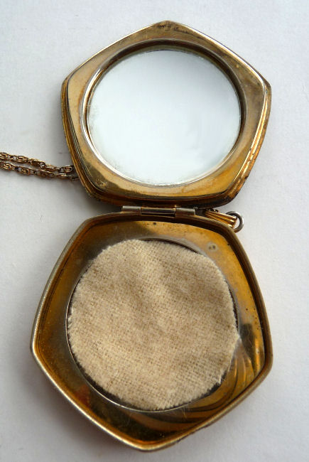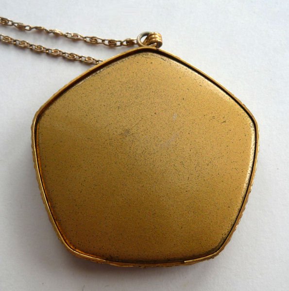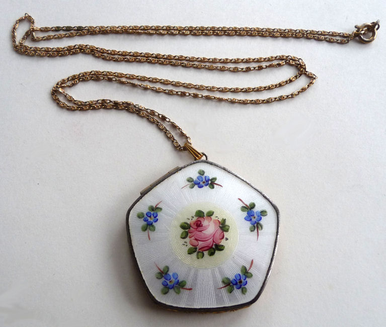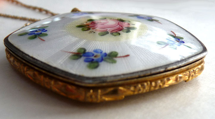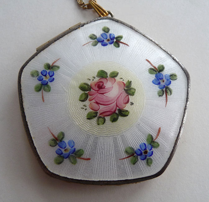 This little pendant compact is done in a pentagon shape and has a very pretty design to the enamel guilloche on the front -- you have to look at the pictures to see. The center pink rose is set in an ivory background of concentric circles. Outside that is a snow white background of radiating bands in the guilloche with hand-painted blue flowers encircling the entire edge. And the side edges are richly embossed in a beautiful cut design. The compact opens from the lower right corner and has a mirror in the lid and an open powder well in the base. There is a wisp of cloth in there for a puff but not original. It is unmarked but reminds me of Evans compacts that I have had that are similar ... usually marked with paper labels which are lost with time. Enameling is in pretty good condition overall .. there is one teeny scratch only in clearcoat which can be felt rather than seen. Other than that it is great. Back of compact is just gold tone metal which does show minor wear. Comes with gold rope chain. Measures 1-3/4" wide at top of pentagon x 1-5/8" high overall. (Click on pic for more photos.) |