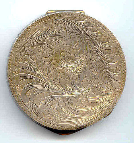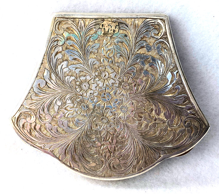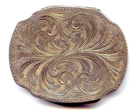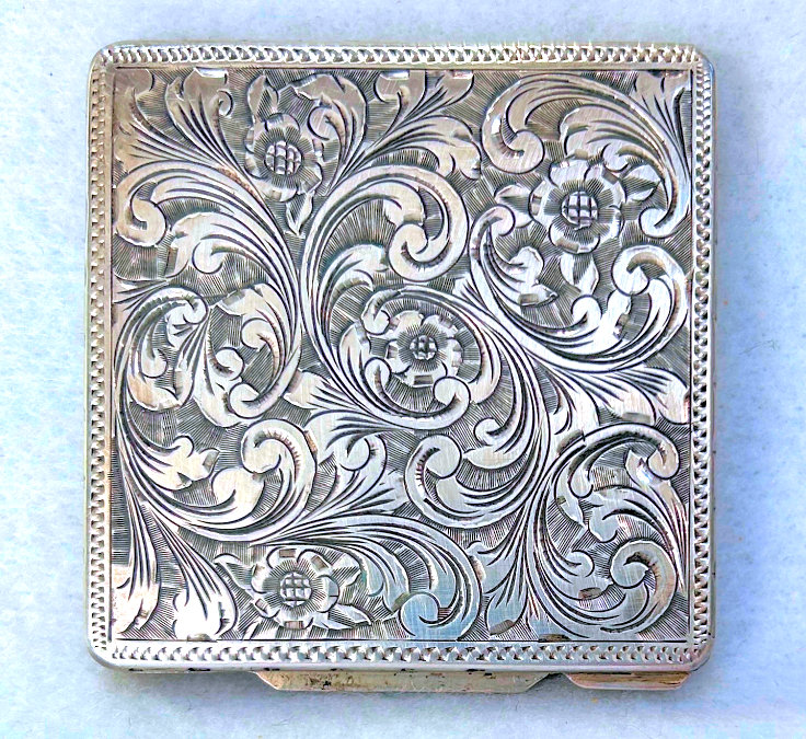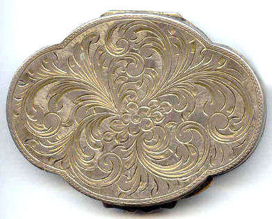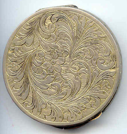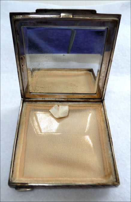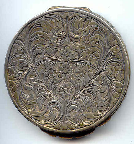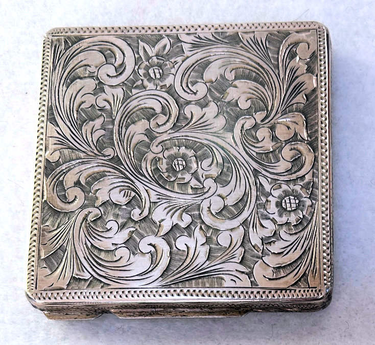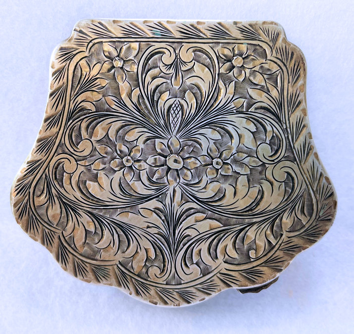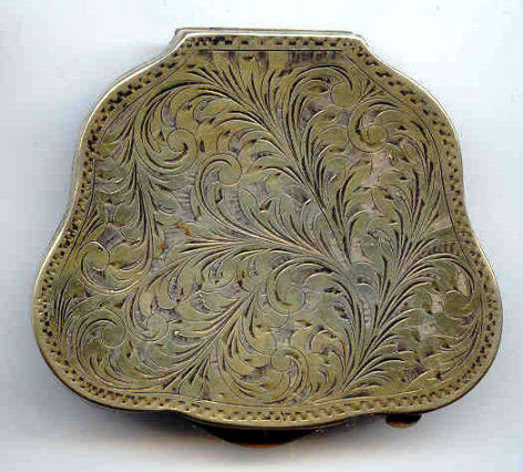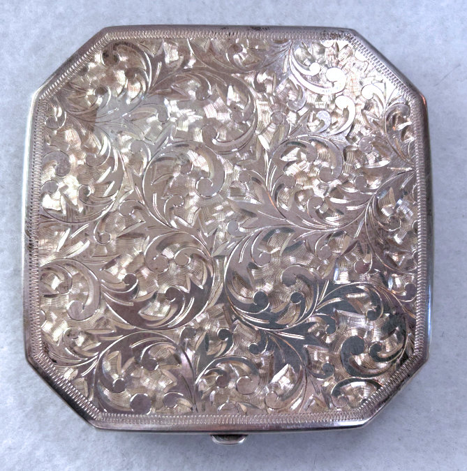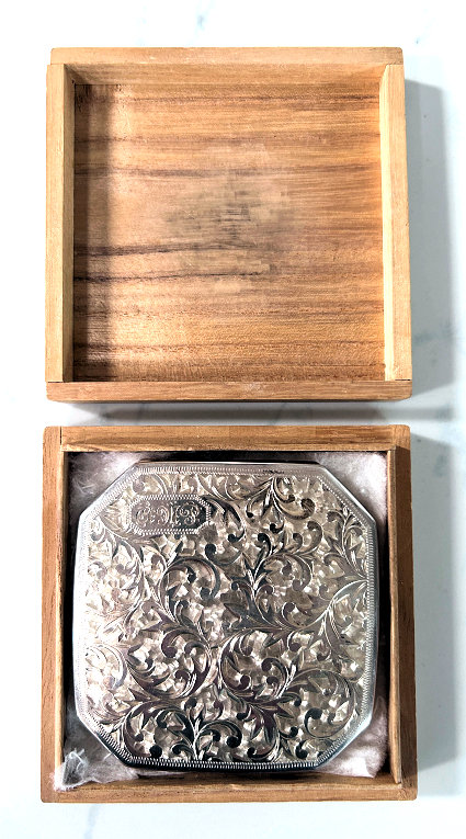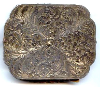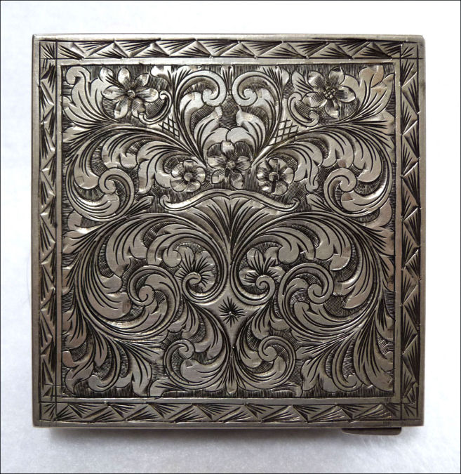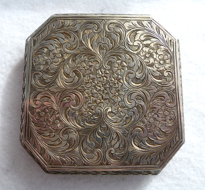 Wow! is all I can say about this compact. The engraving on this compact is referred to as "Bright-Cut" and was used on luxury items from the 1920's to 1930's era. It is not machine done but rather hand-engraved with a flat graver tool that cuts shallow facets into the silver which catches the light like gemstones.I have never had another like this and it is truly gorgeous. Inside is a round beveled mirror in the lid and a covered powder well in the bottom with original puff and screen, both never used. It is marked Silver 950* in the powder well and there is a monogram on the lid that I think reads "AMP" but I can't be sure it is so fancy. It comes in its original wooden box for protection which is also a sign of high-quality luxury items sold in France in the Art Nouveau thru Art Deco period.. Although unmarked, the SILVER 950 mark and design of the interior signify that it was made in France. Measures approx. 3" square. Box is 3-5/8" square. *The SILVER 950 mark denotes a higher purity than sterling: 950 silver = 95% pure silver. This marking and the design are most likely French in origin. (Click on pic for more photos.) |