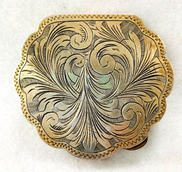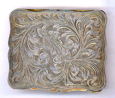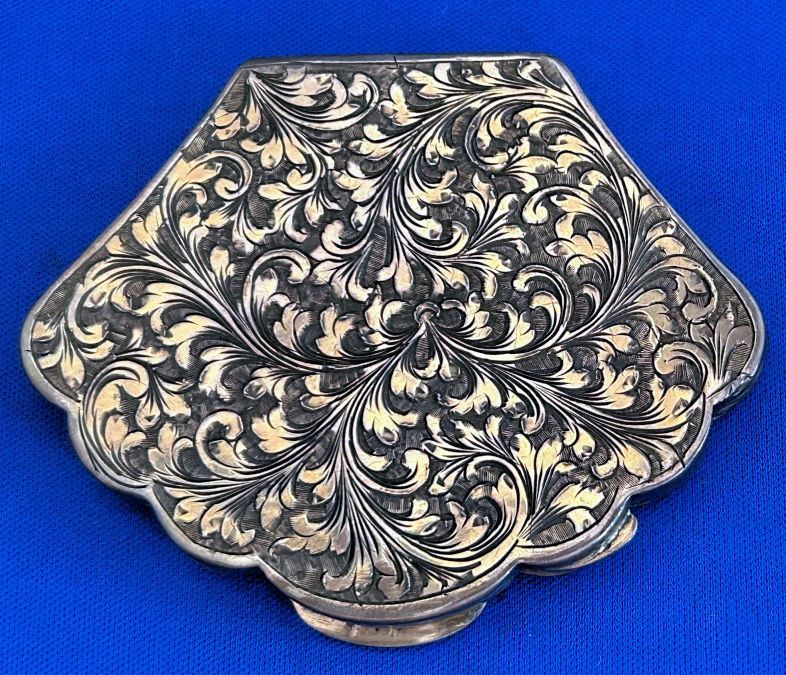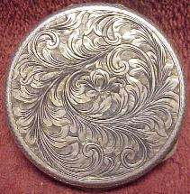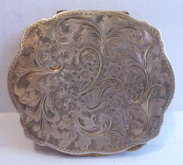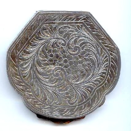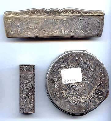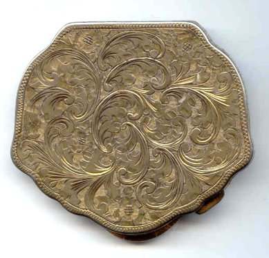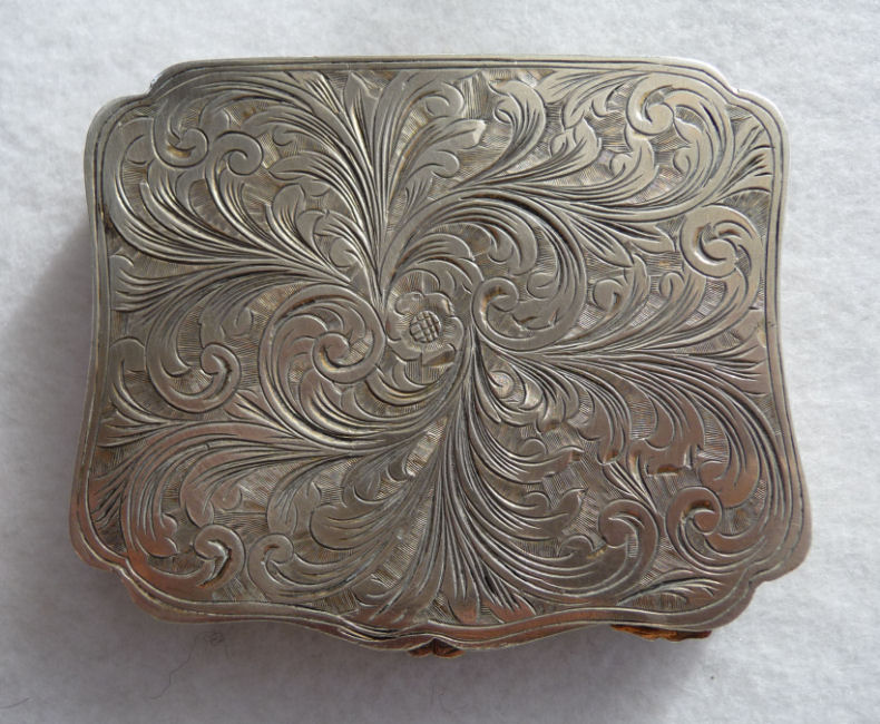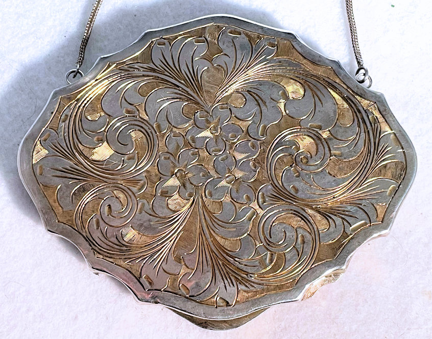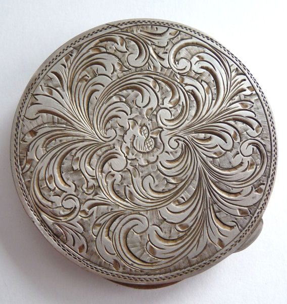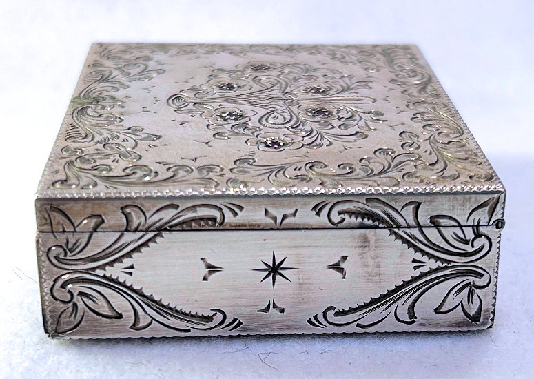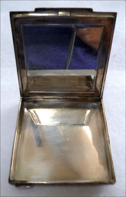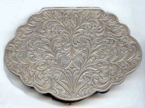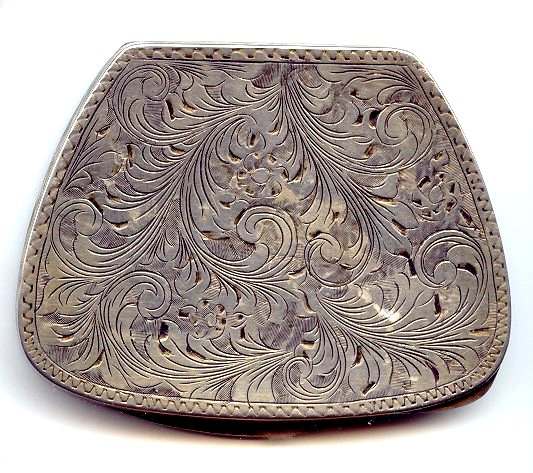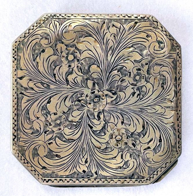 Wow! is all I can say about this compact. The engraving on this compact is referred to as "Bright-Cut" and was used on luxury items from the 1920's to 1930's era. It is not machine done but rather hand-engraved with a flat graver tool that cuts shallow facets into the silver which catches the light like gemstones.I have never had another like this and it is truly gorgeous. Inside is a round beveled mirror in the lid and a covered powder well in the bottom with original puff and screen, both never used. It is marked Silver 950* in the powder well and there is a monogram on the lid that I think reads "AMP" but I can't be sure it is so fancy. It comes in its original wooden box for protection which is also a sign of high-quality luxury items sold in France in the Art Nouveau thru Art Deco period.. Although unmarked, the SILVER 950 mark and design of the interior signify that it was made in France. Measures approx. 3" square. Box is 3-5/8" square. *The SILVER 950 mark denotes a higher purity than sterling: 950 silver = 95% pure silver. This marking and the design are most likely French in origin. (Click on pic for more photos.) |