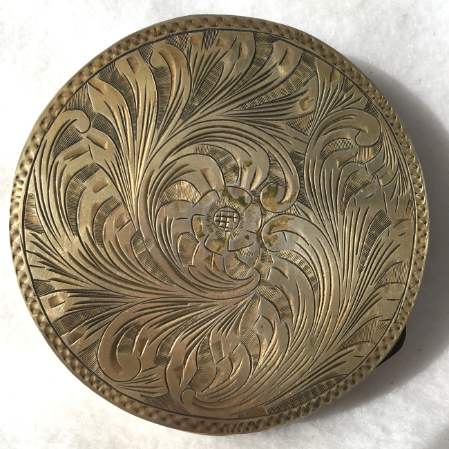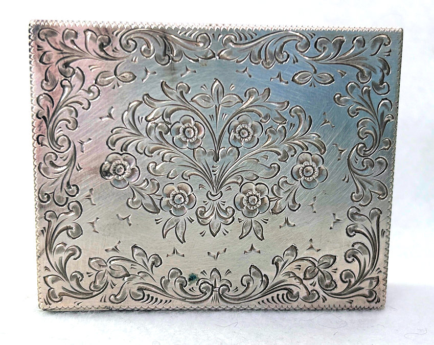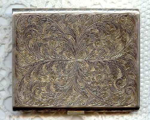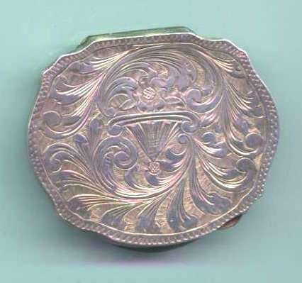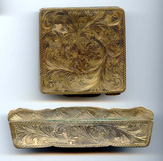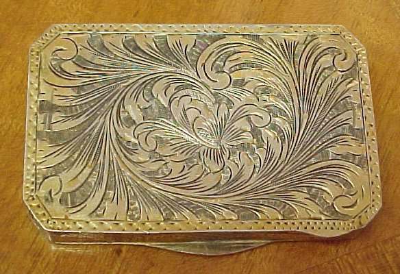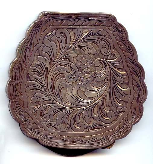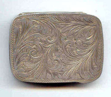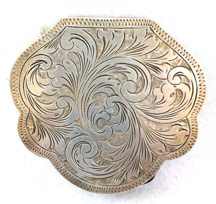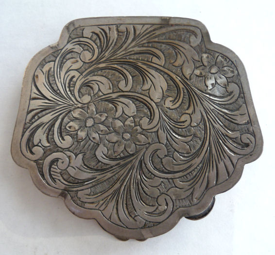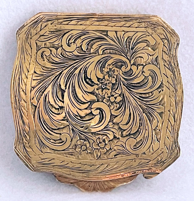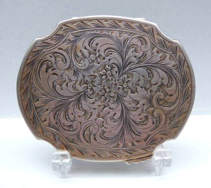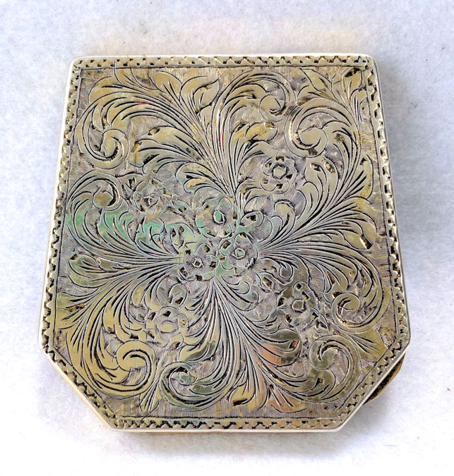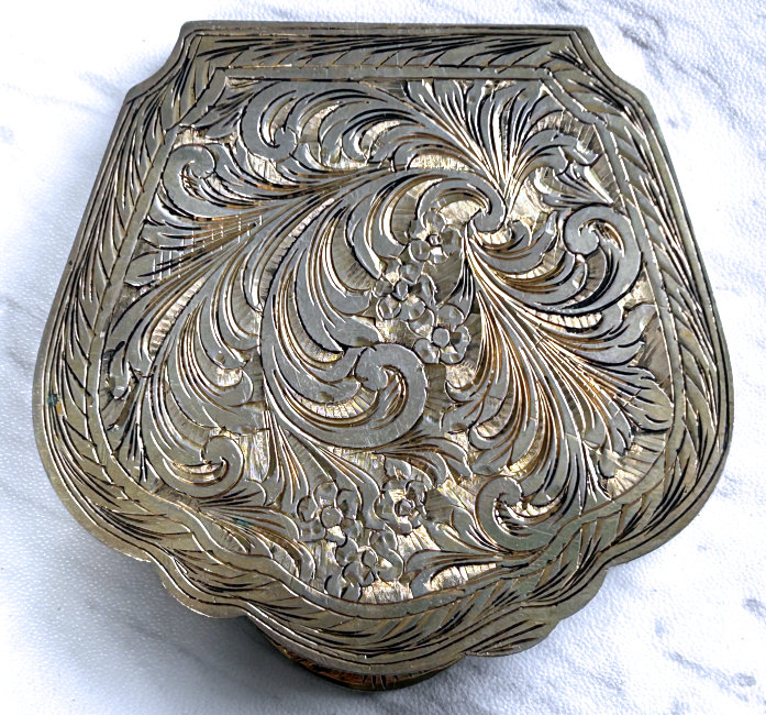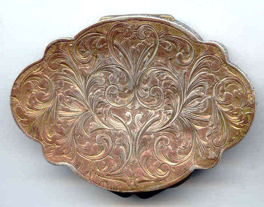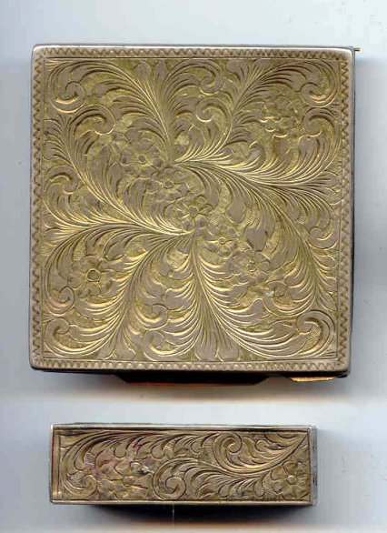 Wow! is all I can say about this compact. The engraving on this compact is referred to as "Bright-Cut" and was used on luxury items from the 1920's to 1930's era. It is not machine done but rather hand-engraved with a flat graver tool that cuts shallow facets into the silver which catches the light like gemstones.I have never had another like this and it is truly gorgeous. Inside is a round beveled mirror in the lid and a covered powder well in the bottom with original puff and screen, both never used. It is marked Silver 950* in the powder well and there is a monogram on the lid that I think reads "AMP" but I can't be sure it is so fancy. It comes in its original wooden box for protection which is also a sign of high-quality luxury items sold in France in the Art Nouveau thru Art Deco period.. Although unmarked, the SILVER 950 mark and design of the interior signify that it was made in France. Measures approx. 3" square. Box is 3-5/8" square. *The SILVER 950 mark denotes a higher purity than sterling: 950 silver = 95% pure silver. This marking and the design are most likely French in origin. (Click on pic for more photos.) |